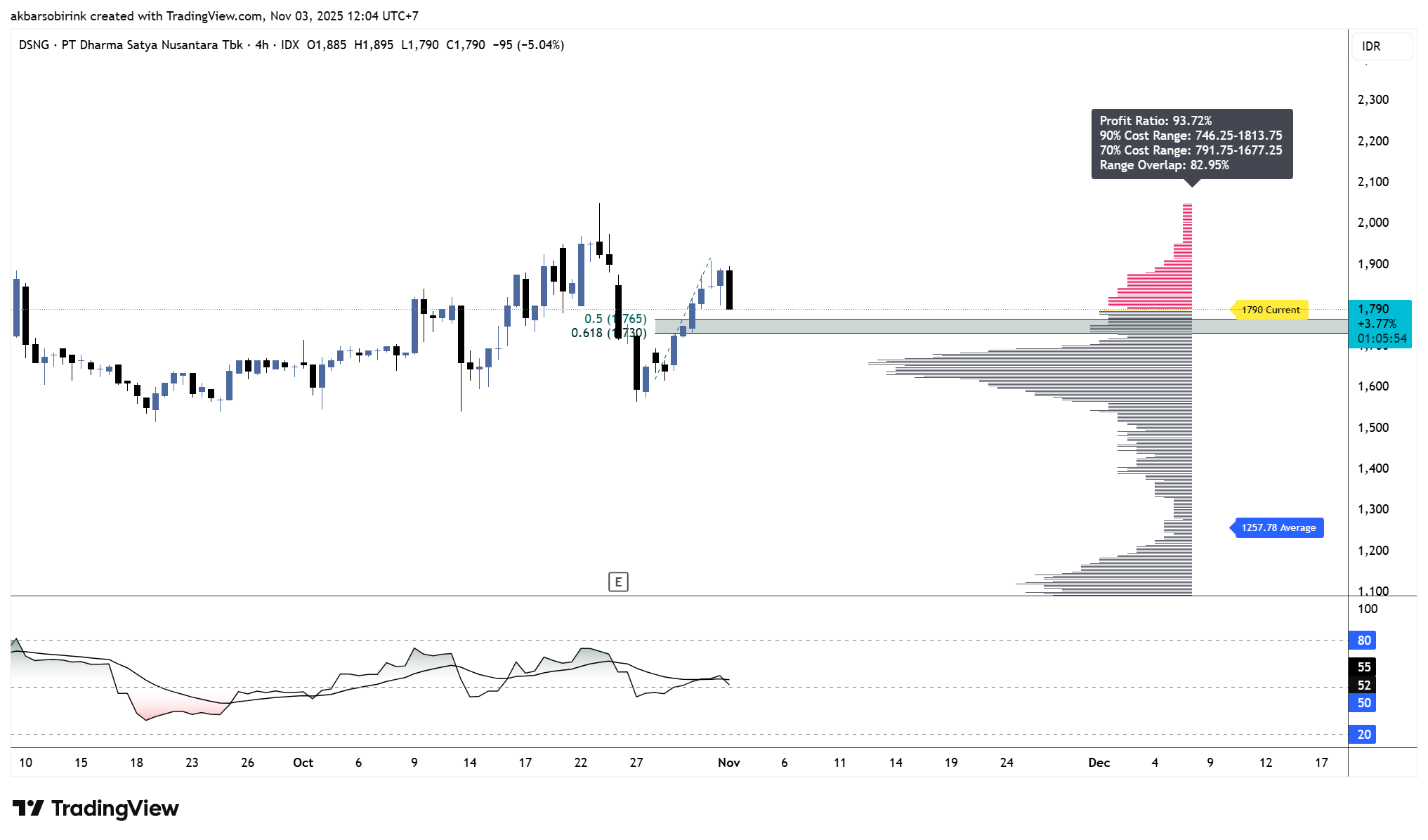 Chip hitam masih dominan di bawah 1.700–1.800, artinya barang belum banyak dilepas — akumulasi masih rapi.