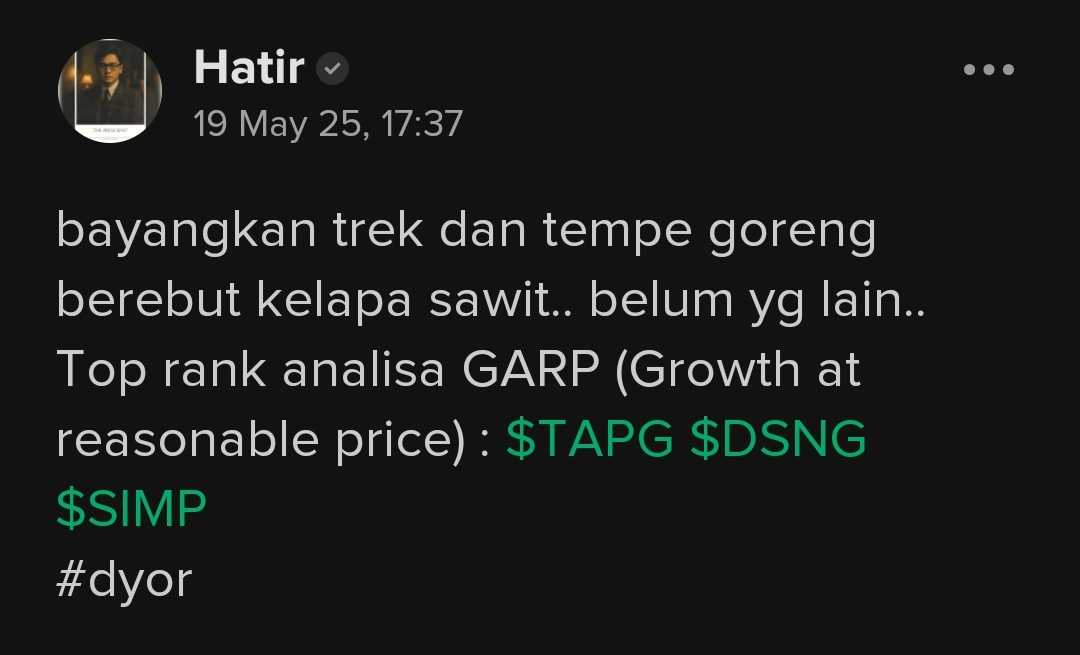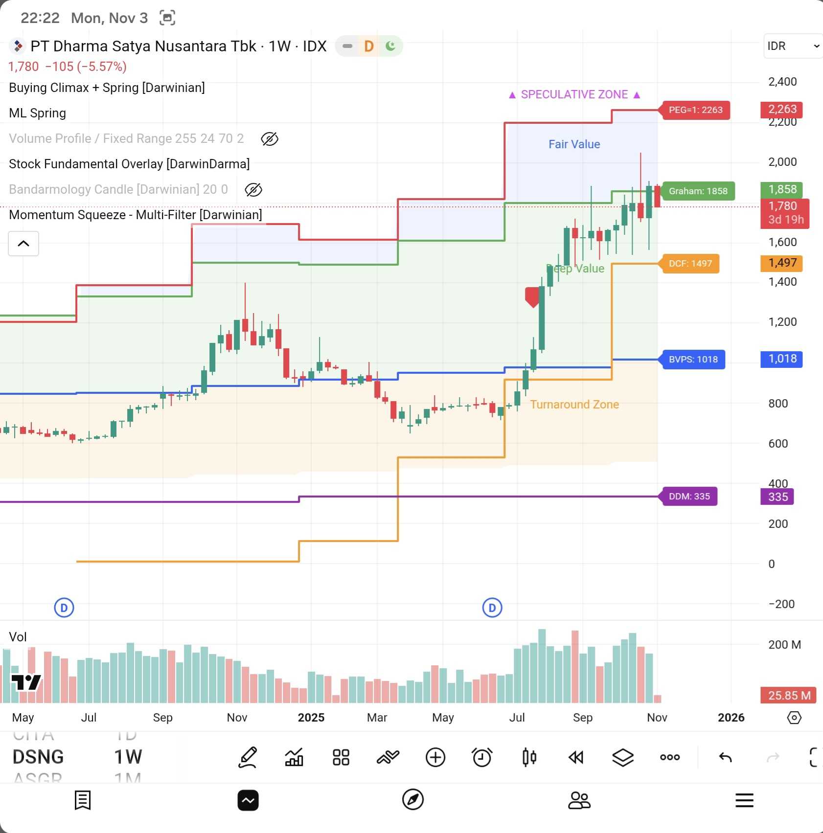@syarifuchiel $DSNG di chart 1W terlihat kenaikan dari April mengikuti fundamental metricnya, BVPS, DCF, Graham Number, 1PEG semuanya meningkat.. dan harga tampaknya ditarik garis2 fundamental, pertama harga breakout DCF, lalu breakout BVPS dan sekarang sedang berusaha breakout Graham Number, jika berhasil breakout, target selanjutnya 1PEG (PEG = 1).. sekarang berada di Deep Value Zone.. jika di ukur pake Earning Growth, masih undervalue.. tidak ada tanda distribusi.. layak pantau, return sampe target akhir lumayan lebar..