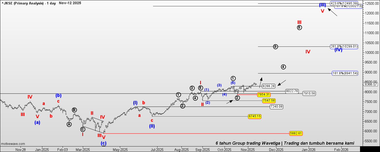 Dengan asumsi wave 2 hitam sudah selesai di 7854, penembusan area resisten 8288 yang menjadi area puncak dari wave 1 hitam bisa membuka peluang naik IHSG untuk menyelesaikan 5 swing naik wave (III) biru sampai ke area 10299 - 12495