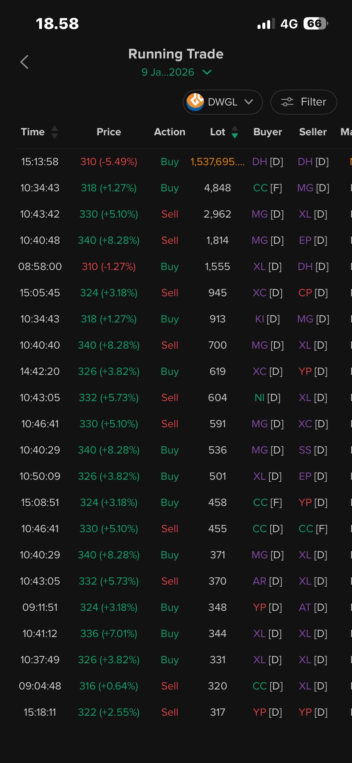 $DWGL MG aj berani masuk dgn top buyer di 335 dan masih sangkut.pantau senin apakah MG akan tarik naik lagi ke 360.