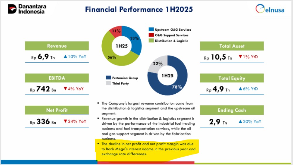 Di Public Expose ELSA September 11th, 2025, disebutkan penurunan net-profit adalah disebabkan oleh kenaikan beban bunga Bank Mega dan selisih kurs ( https://cutt.ly/xr0I322I / capture screen terlampir ).