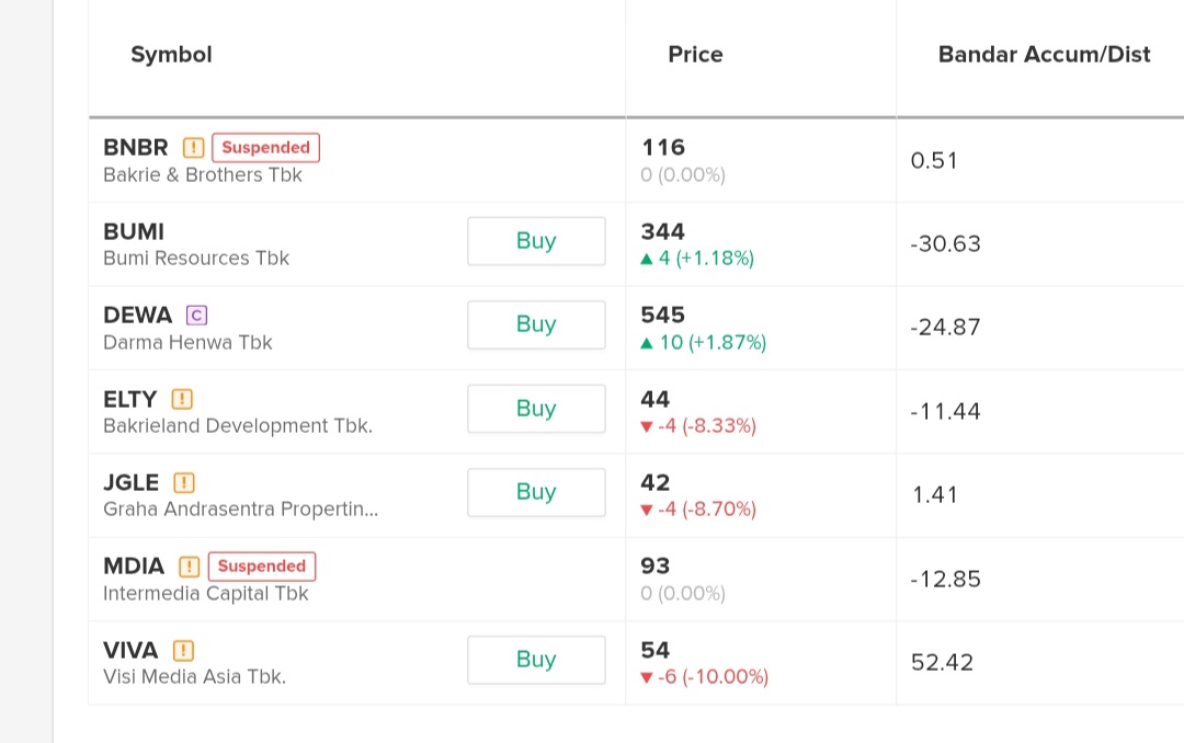 sama kayak waktu turun kmrn, sekalinya turun ya turun bareng $VIVA $JGLE $ELTY , cmon BNBR dan MDIA segera rilis laporan2 yg dibutuhi BEI biar cepet lepas dari penjara suspend juga wkwk