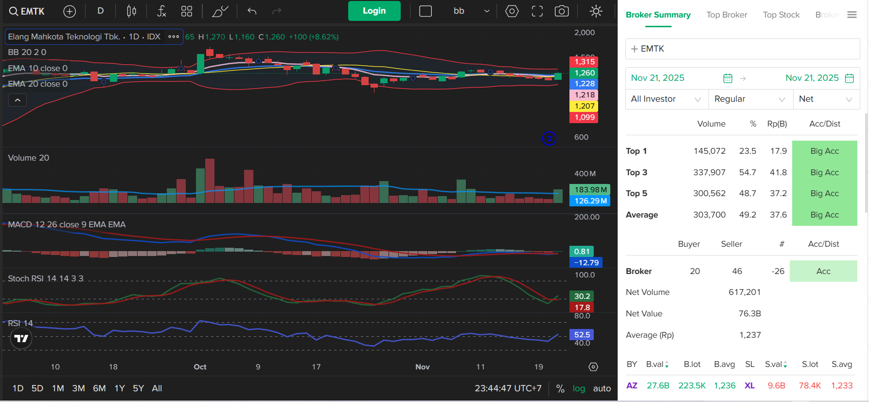 Stoch RSI mulai berbalik naik dari area bawah, MACD mendekati potensi golden cross, dan broker summary didominasi big accumulation. Ini menguatkan sinyal bahwa tekanan beli semakin mendominasi.