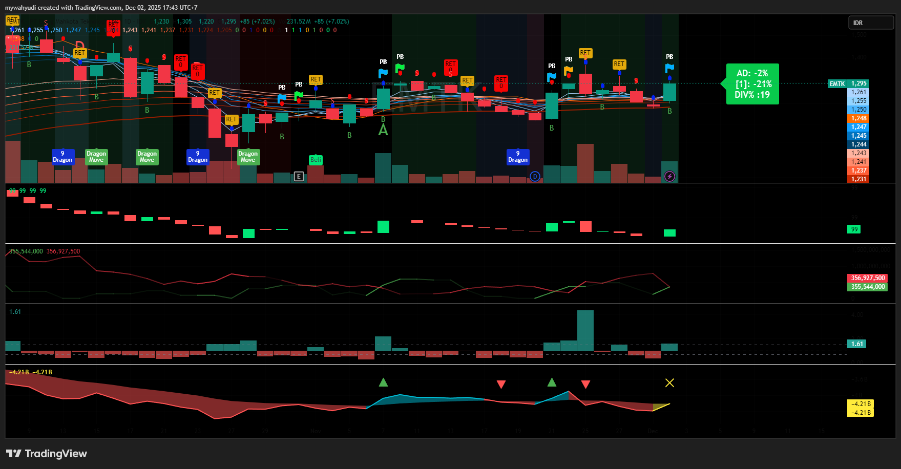 $EMTK hari ini manteb inflow dan volumenya dibanding dengan 20 hari rata rata nya .. data teknis blue dot. signal buy. green flag div 19 hijau pekat vpa terbentuk.artinya kenaikan volume diikuti dengan kenaikan harga..=akumulasi.. target terdekatnya 1375