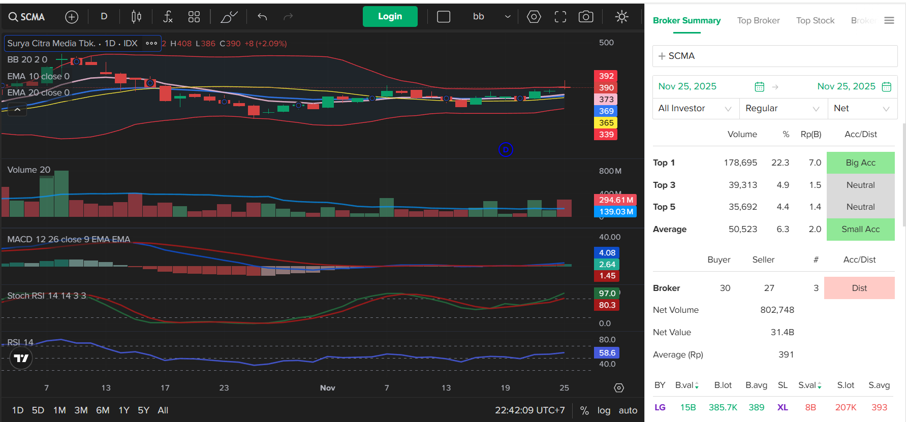 SCMA menunjukkan tanda reversal awal, dengan accumulation dari broker besar. Momentum bullish mulai terbentuk.