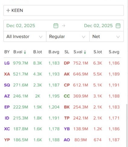 $KEEN pertanda lanjut terbang karena bandarnya broker LG scalping lagi. Kalo di tarik panjang selama 2 bulanan , LG ini tek-tok serok bawah, jual atas, ngikutin volatilitas kenaekan KEEN. Info org sekuritas ini ownernya yg pake LG utk maenin KEEN jd bandar sndiri. Tp gpp karena dia jg tau trajectory nya lanjut terus naek ke arah 2000, gak masalah mau di maenin jual beli, selama di range volatilitas wajar aja. Kita tinggal ngikut aja bossque, hold sampe 2000.