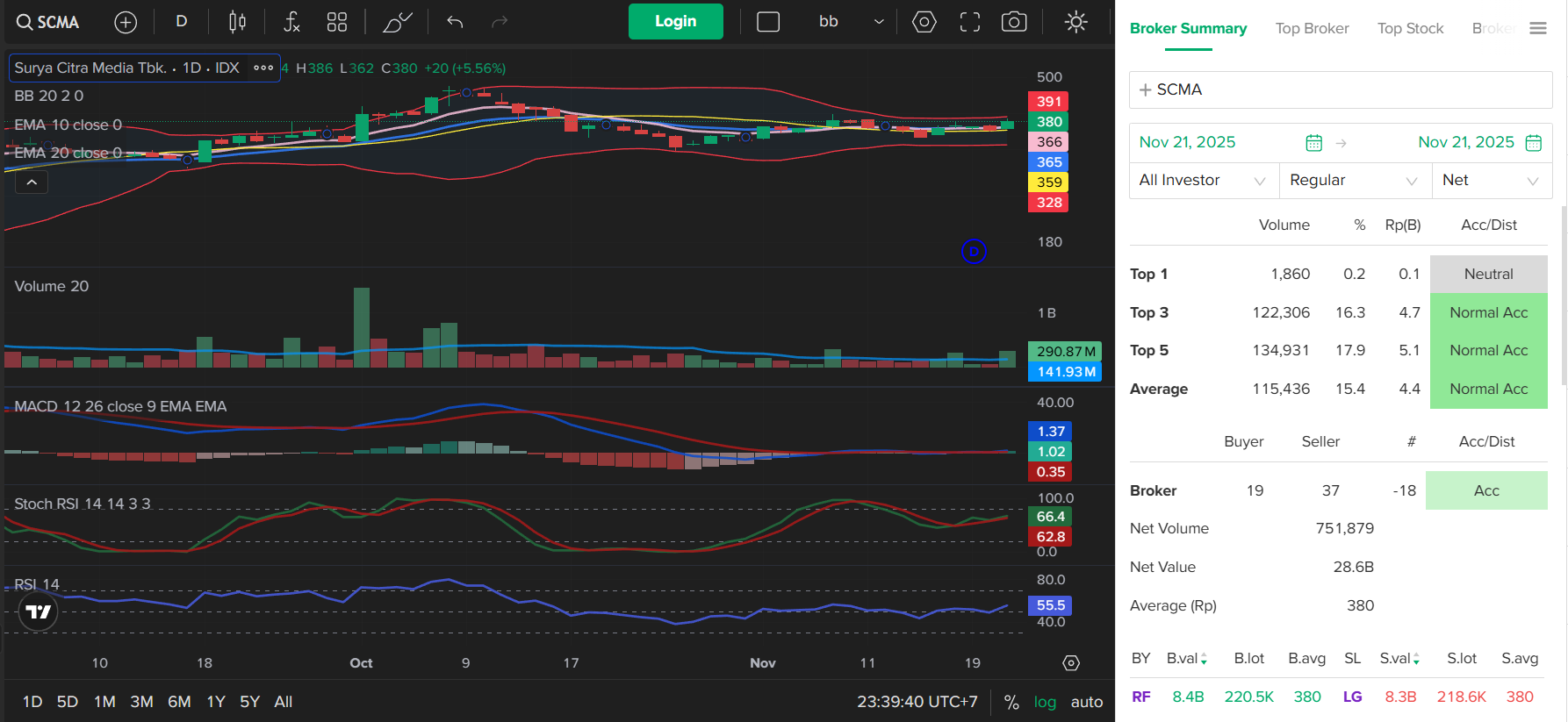 SCMA ditutup menguat ke 380 dengan volume meningkat cukup signifikanβmenandakan mulai ada akumulasi setelah fase sideway panjang. Harga kembali berada di atas EMA10 & EMA20 meski masih sangat dekat, memberi sinyal awal perbaikan tren. MACD mulai menggulung ke atas meski masih di area negatif, sementara Stoch RSI sudah naik dan mulai memberi momentum bullish. Broker summary menunjukkan akumulasi normal, artinya mulai ada minat beli yang stabil.