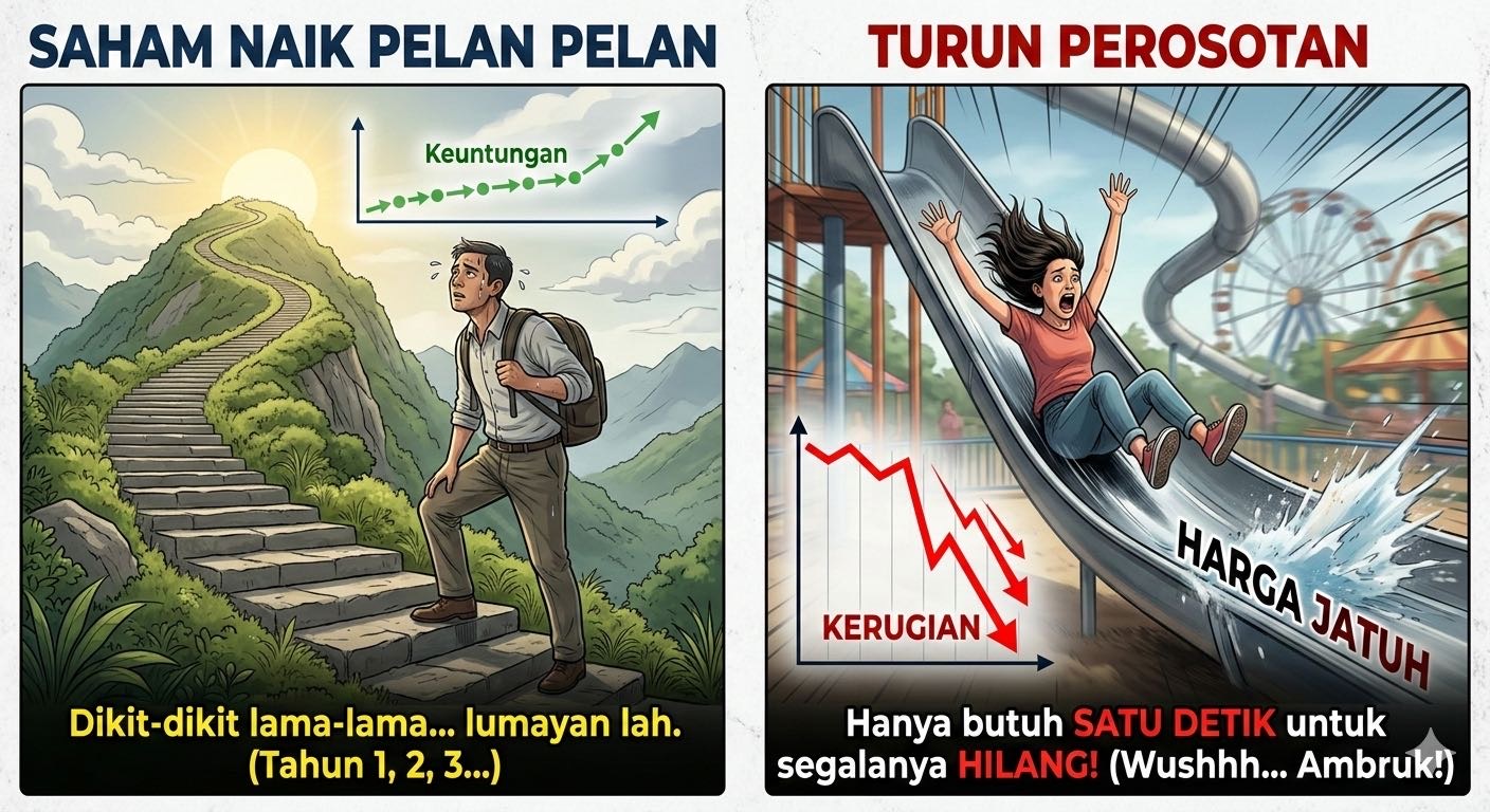 Istilah “naik pelan-pelan, turun perosotan” itu sering dipakai di saham Dan memang itu pola yang sangat umum di pasar.