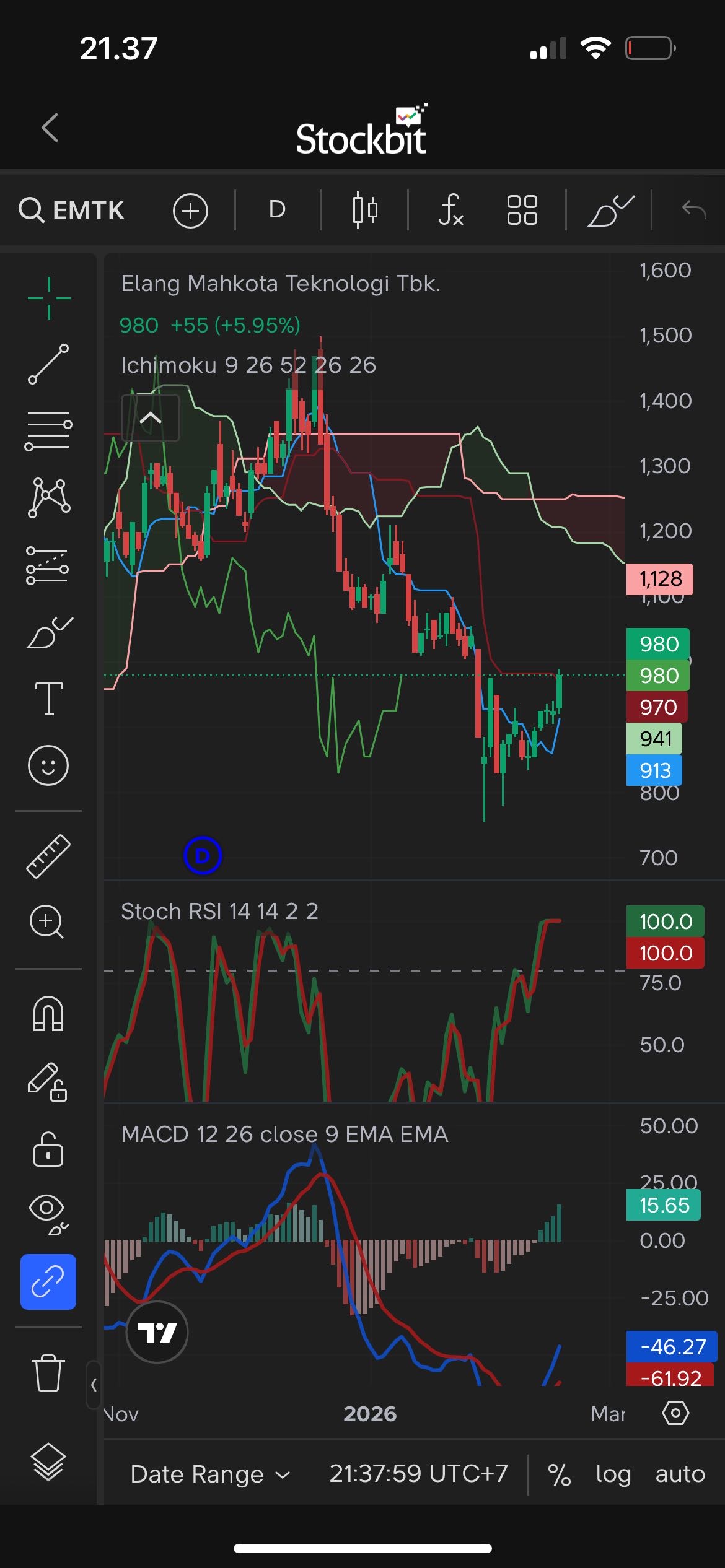 $EMTK Menguji level psikologis Rp 1.000. Jika mampu ditembus dengan volume tinggi, target selanjutnya adalah area Rp 1.100 - Rp 1.150.