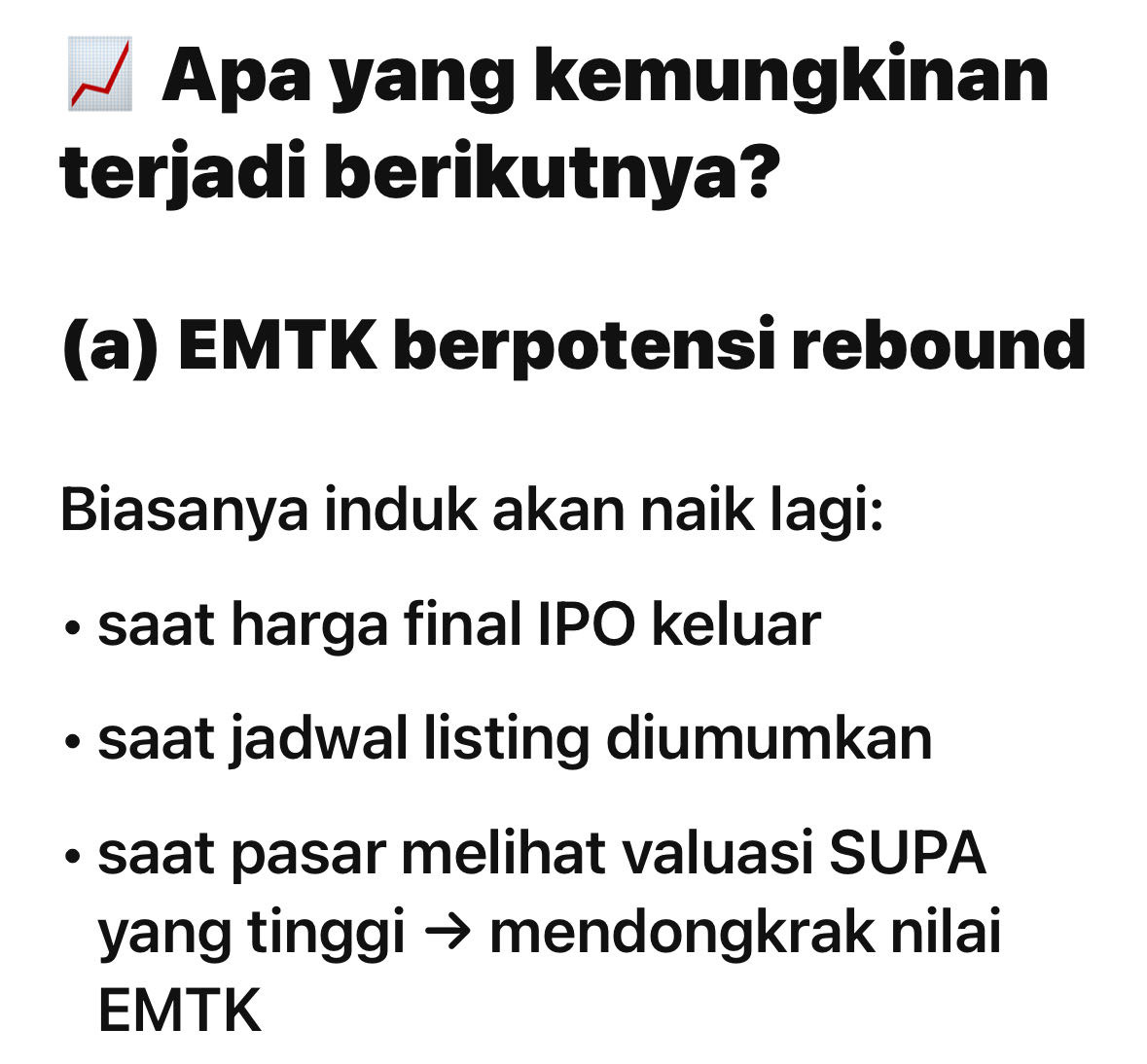 $EMTK turun berapapuuunnn tetappp saya HOLD KERASS ga akan sya jual murahh… bau2 si $SUPA ini meledak ordernya… yg belom masuk $EMTK bisa di pertimbngkan mumpung ini diskon gila2 an hari ini…