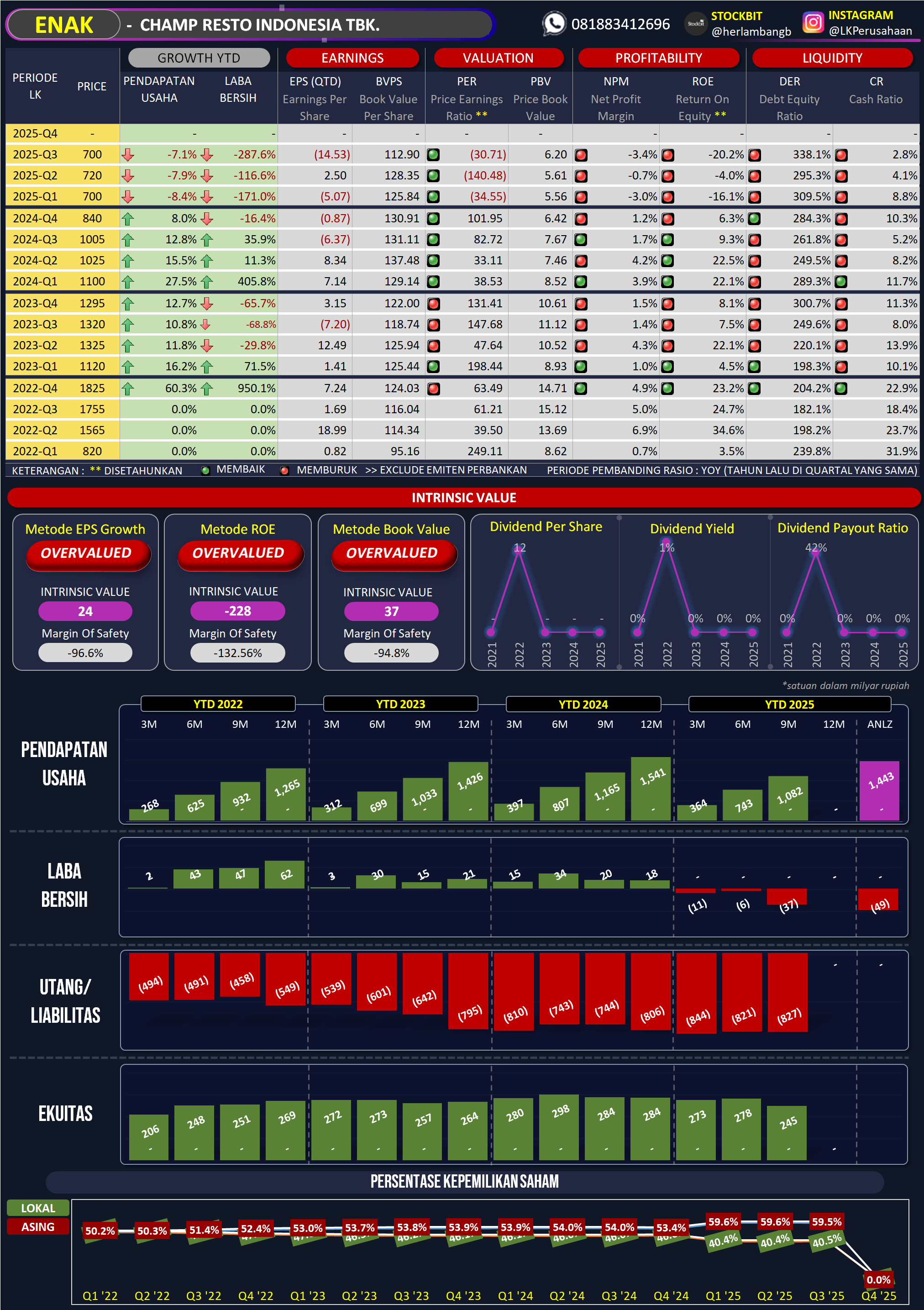 - Kepemilikan BMF: BMF merupakan pemegang saham pengendali yang menguasai 54,22% dari keseluruhan saham yang dikeluarkan ENAK, setara dengan 1.174.868.800 lembar saham.