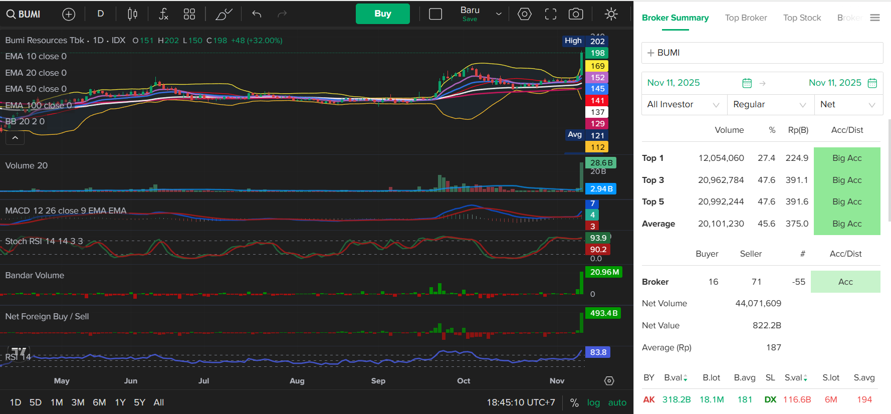 Harga melonjak +32% ke 198, breakout kuat diiringi volume besar dan akumulasi besar (Big Acc) di semua top broker. RSI 83 menunjukkan overbought namun masih momentum kuat, MACD positif lebar, dan ada potensi lanjut short-term rally.