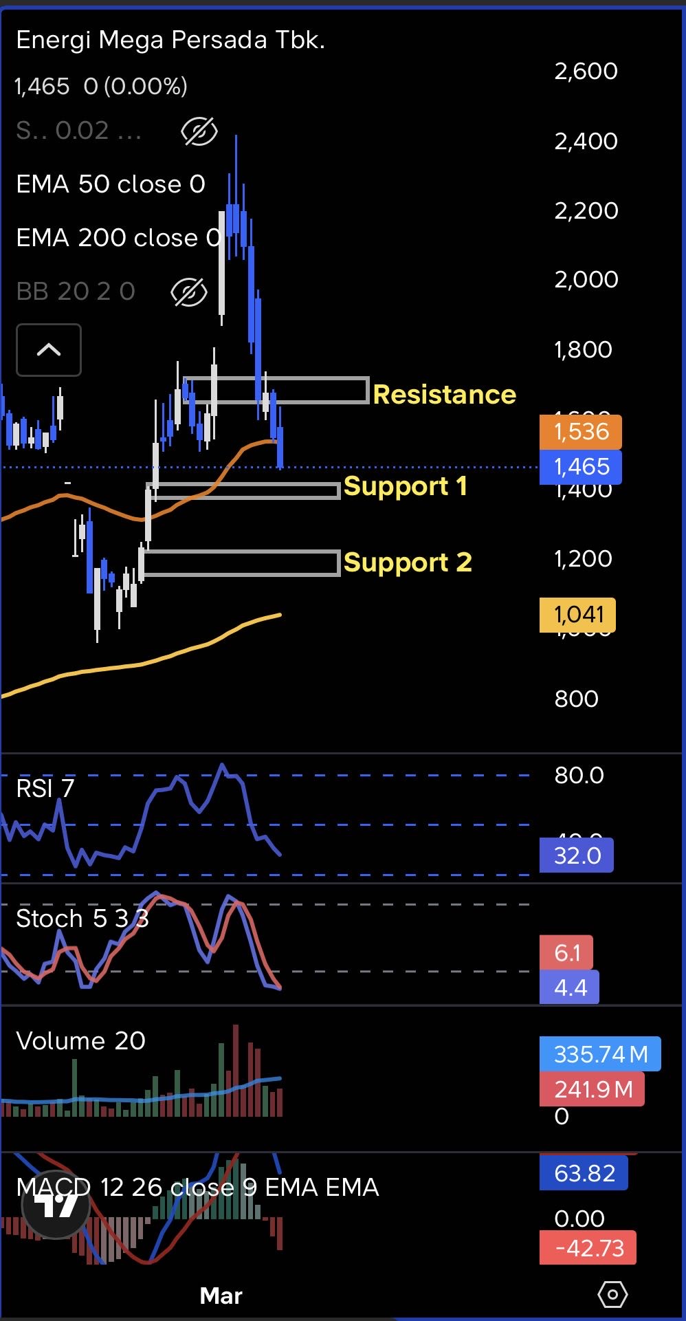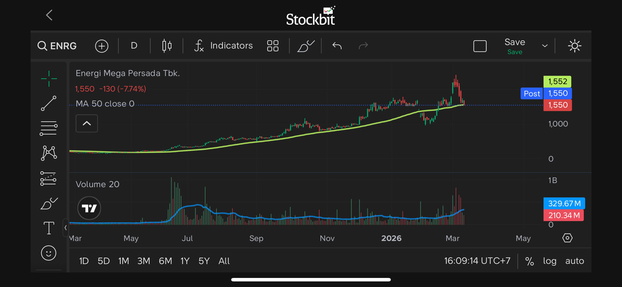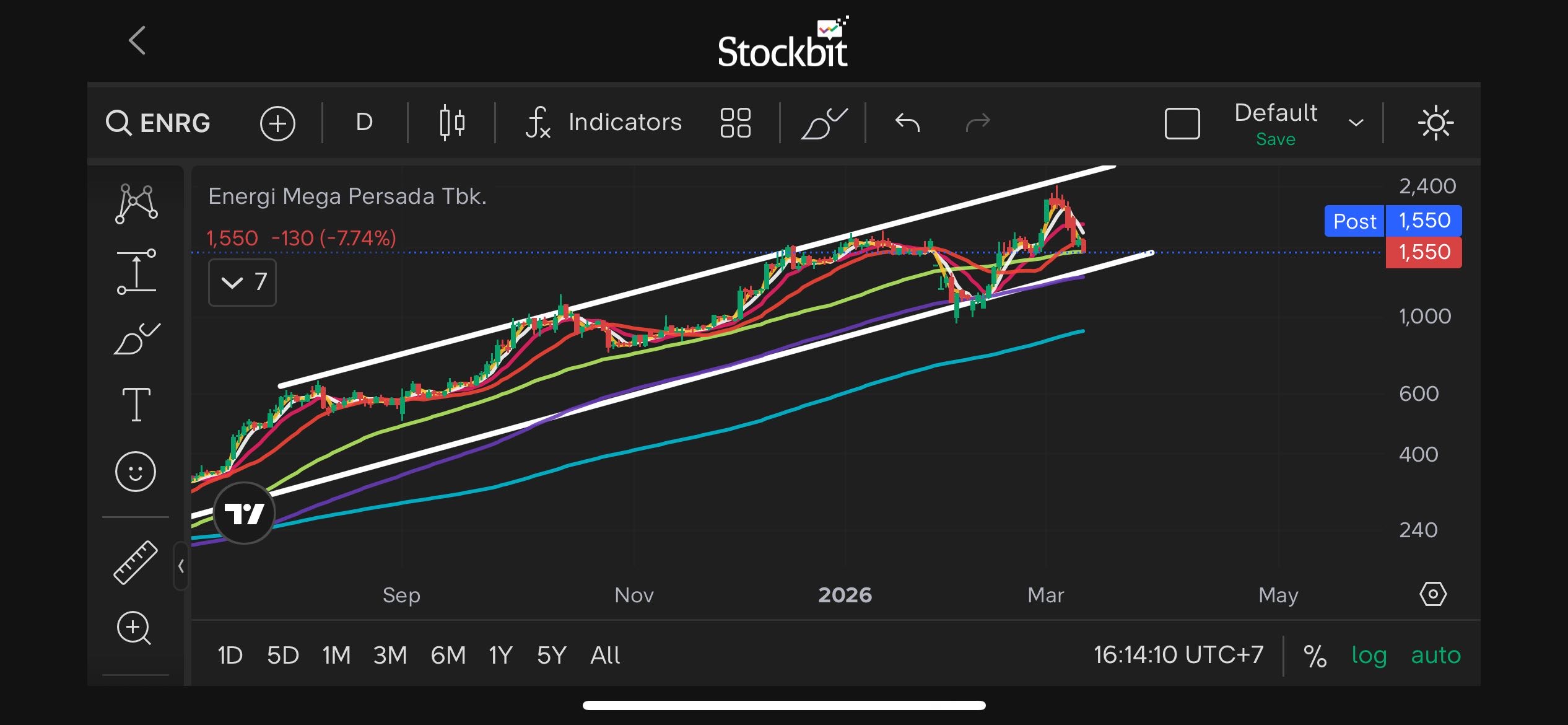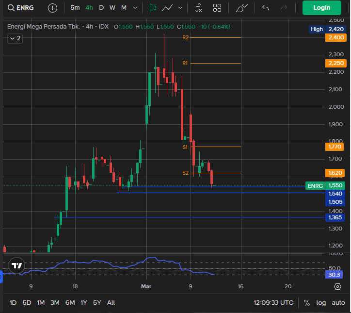 Kalau melihat struktur chart harian, ENRG sebenarnya masih berada dalam fase uptrend yang cukup jelas. Harga bergerak stabil di atas MA50 dan selama beberapa bulan terakhir pola yang terbentuk adalah higher high dan higher low.
