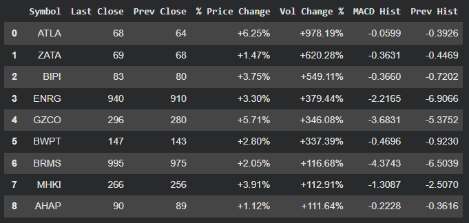 Hasil screener hari ini MACD hampir crossing dengan volume tinggi.
