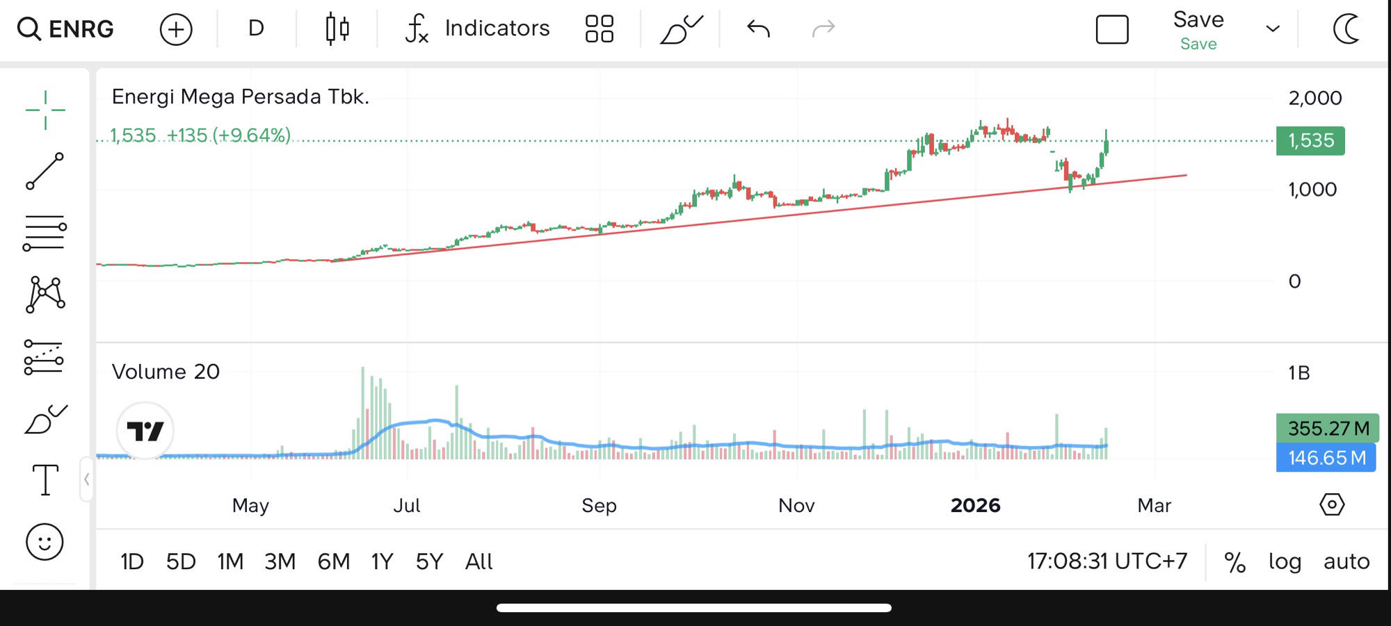 ENRG saat ini berada di area 1.535 setelah mencatat kenaikan hampir 10% dalam satu sesi. Pergerakan ini menarik karena terjadi tepat setelah harga memantul dari area trendline naik jangka menengah.