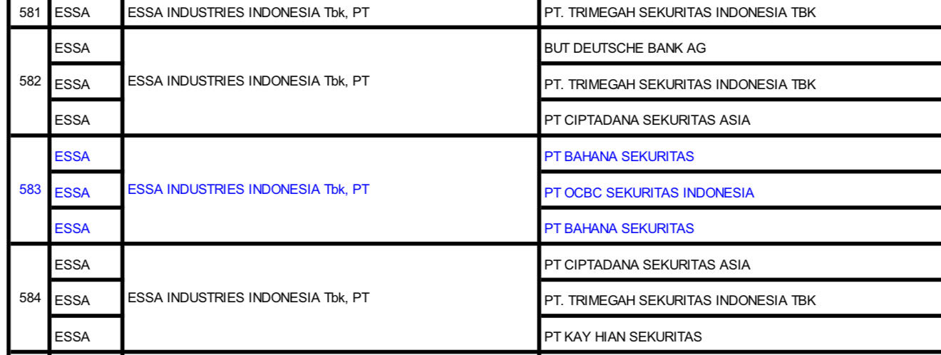 $ESSA Yang susah menggerakkan harga saham salah satu faktornya adalah emitennya jualan, seperti di saham ESSA RF dan DX nya jualan terus menerus dan ditampung oleh asing AK BK ZP dll, setiap harganya breakout emitennya jualan, salah satu faktor yang membuat harganya stagnan under 800, tapi selalu ingat di market itu fleksibel kadang harganya bisa digoreng naik terus, dan kadang ada yang langsung junam.