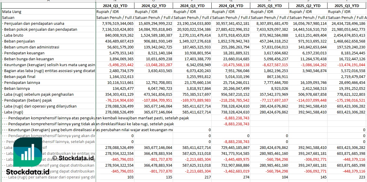 Penjualan Rp24,43T (+5,4% YoY), laba bersih Rp603,4M (+3,1% YoY), EPS ~Rp314. COGS ~Rp21,98T (+5,1% YoY), laba kotor ~Rp2,45T (+8,1% YoY).