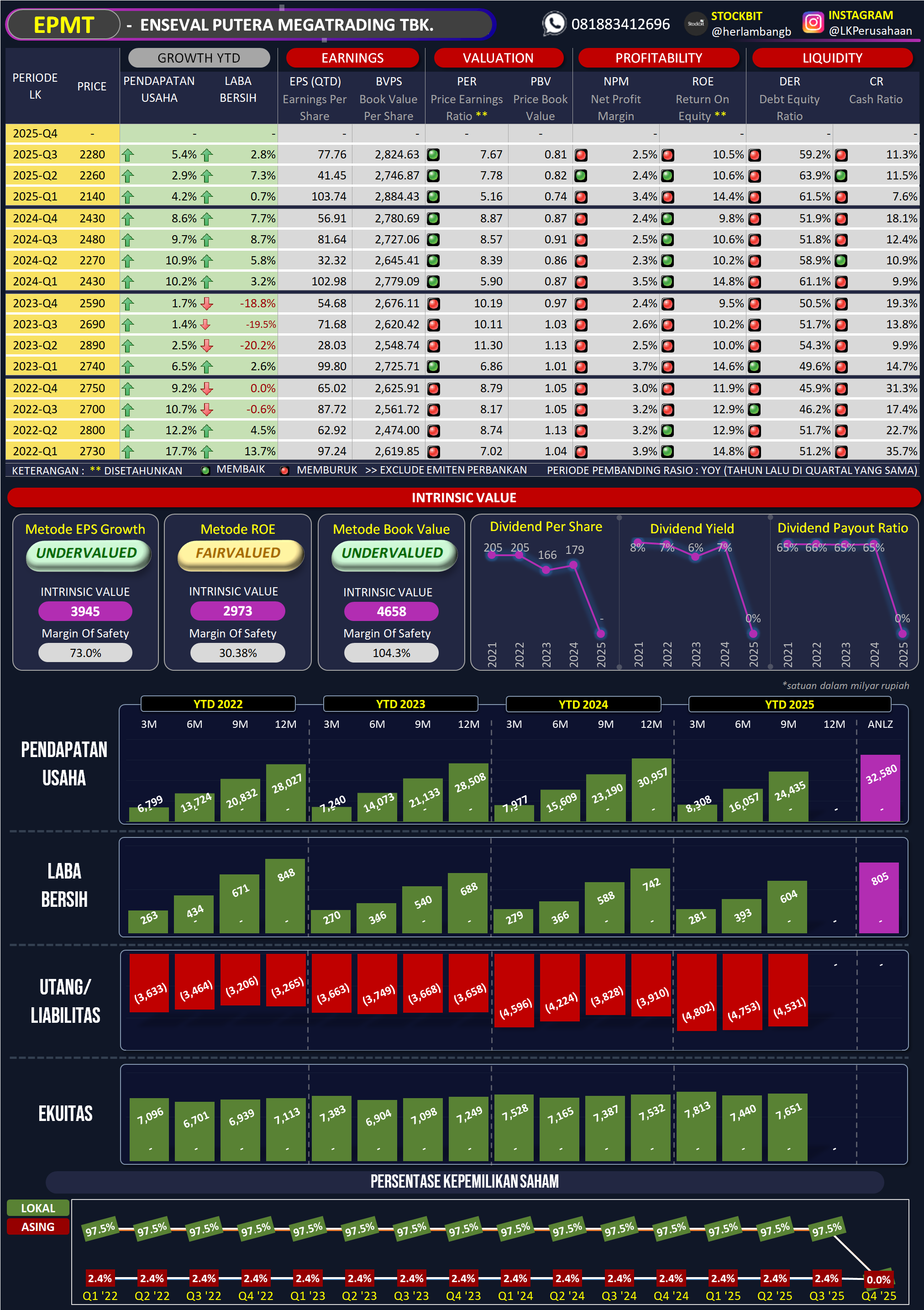 Berikut bedah cepat $EPMT (PT Enseval Putera Megatrading Tbk) Q3-2025 vs Q2-2025 — lengkap dengan valuation, solvency, efektivitas manajemen, CCC (DIO/DSO/DPO), story, dan riwayat GCG.