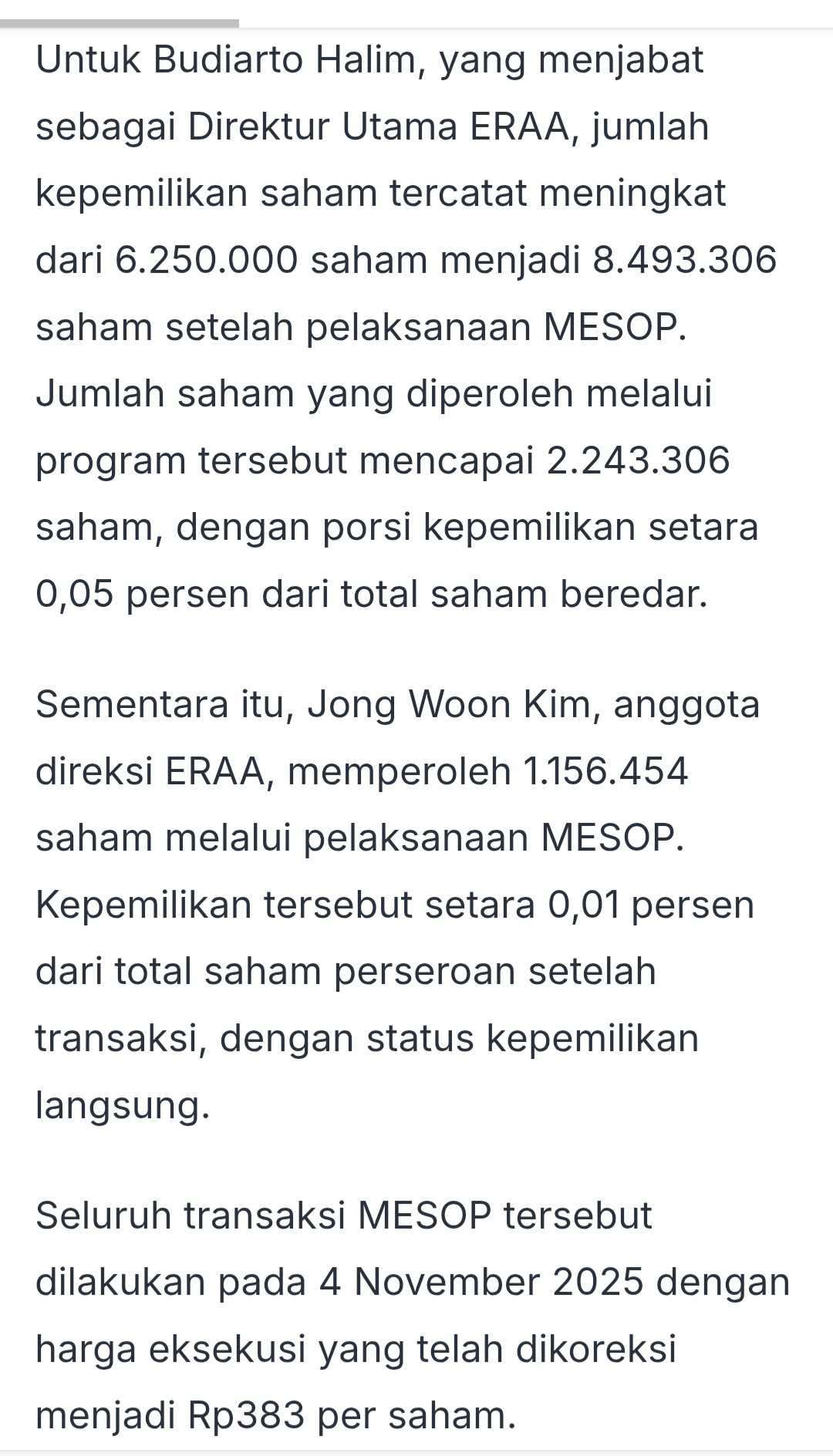 $ERAA Anak Aguan borong saham Erajaya di harga rata2 370 pada bulan Maret 2025, klo skrng 2026 harganya 406 dengan perusahaan yg terus bertumbuh menghasilkan profit, menambah kas dan aset, secara perhitungan value artinya harga masih terlalu murah dan selisih 370-406 itu sedikit, cm selisih 9% saja, artinya harga skrng g jauh beda dgn yg dimiliki ownernya/pengendalinya. Sah2 saja klo owner pegang harga dibawah ritel. Dan patokan harga mesop pun awalnya di patok 437 namun diturunkan jadi 383 supaya lebih murah dari harga pasar 406, artinya harga 406 sudah murah krn sudah dibawah harga patokan awal mesop yaitu 437. Harga mesop pun terbilang wajar krn hanya 383-406 hanya selisih 5% saja, bandingkan dgn mesop $PGEO yg selisih harganya jauh. Harga mesop erajaya pun g mungkin dipatok dibawah harga pengendali/owner. $ACES