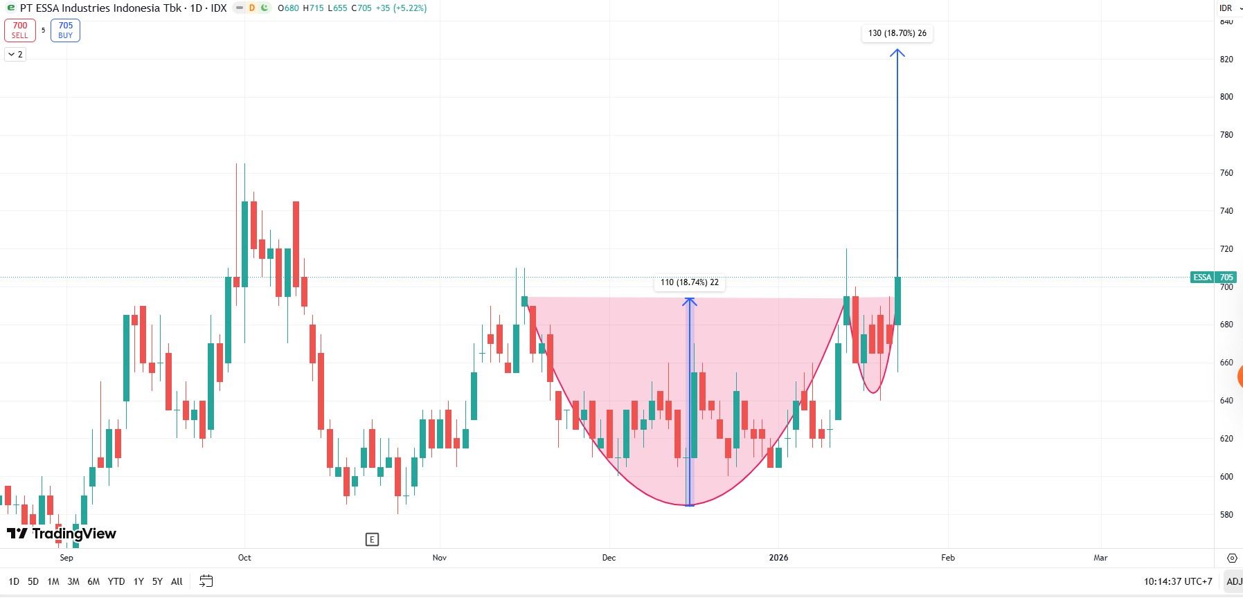 ESSA menunjukkan pola Higher High - Higher Low yang sangat solid sejak September 2025.