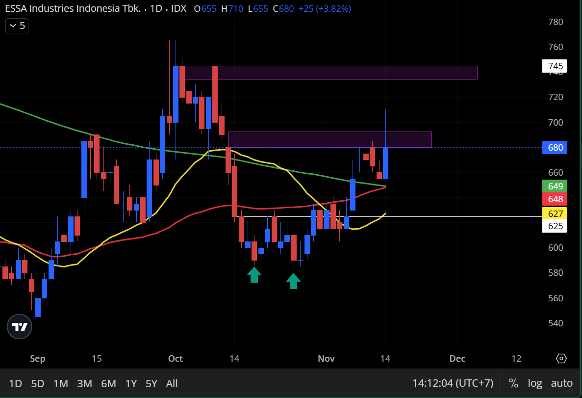 $ESSA Targetnya saat ini ada di 705-710 yaa yg terdekat, klo ESSA bisa BO dari Target ini, ESSA bisa terus naik ke Target berikutnya di 745-750.