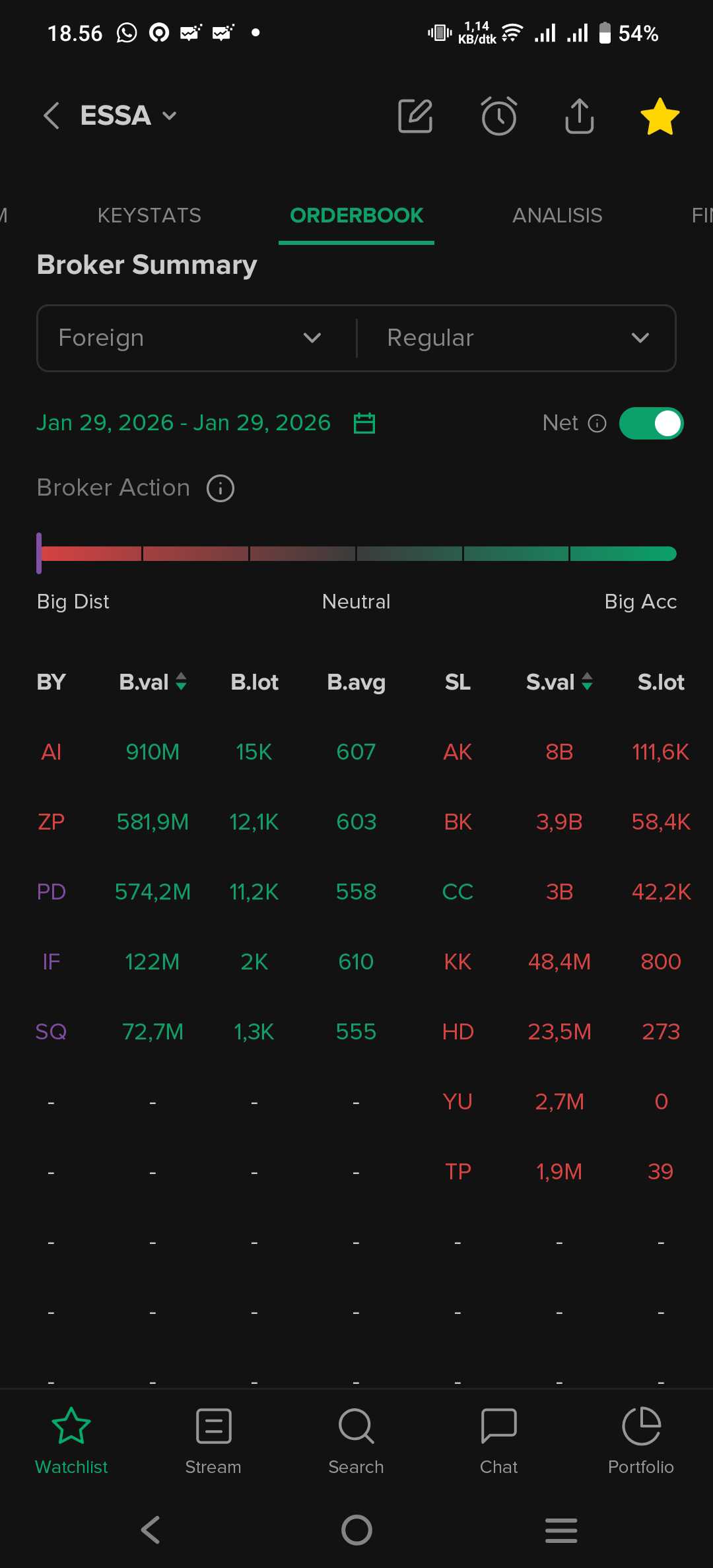 Meskipun GOTO memiliki nilai Net Buy absolut tertinggi secara volume, namun secara rasio agresivitas, $EXCL dan $ESSA memimpin dengan rasio di atas 5x. Ini menunjukkan bahwa setiap ada 1 lembar saham yang dijual asing, ada lebih dari 5 lembar yang dibeli.