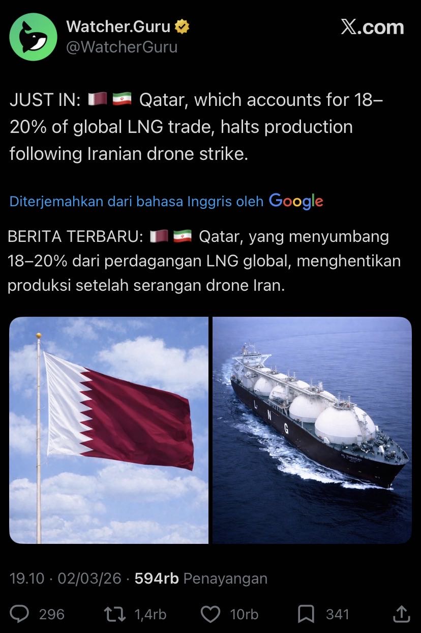 Qatar stop produksi LNG setelah fasilitas energinya diserang. Padahal Qatar supply ±20% LNG global.