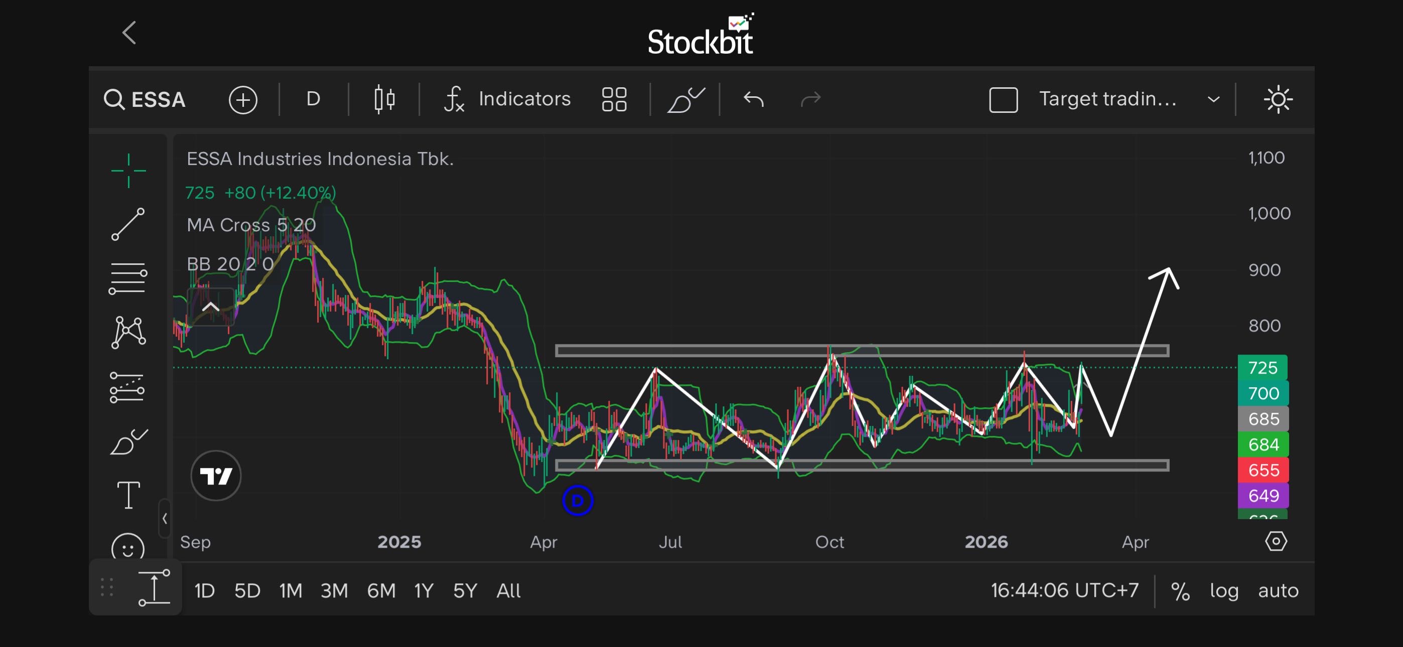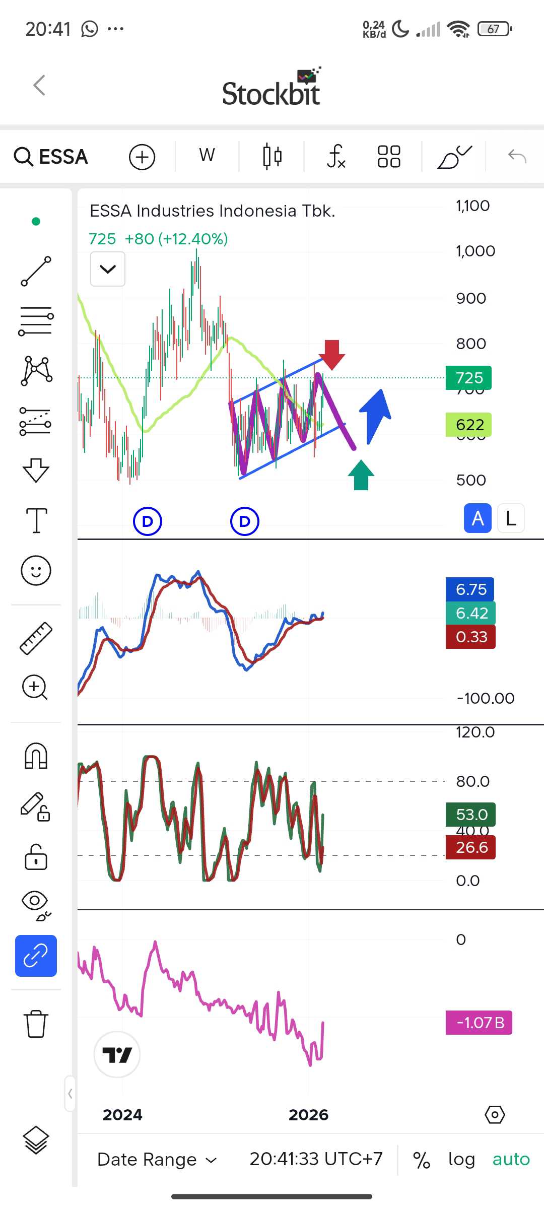 $ESSA menarik kalau dia beneran sampai koreksi lagii bakalan RIBOUND banyak di saat beneran koreksi sampai tanda panas hijau yang saya tandai