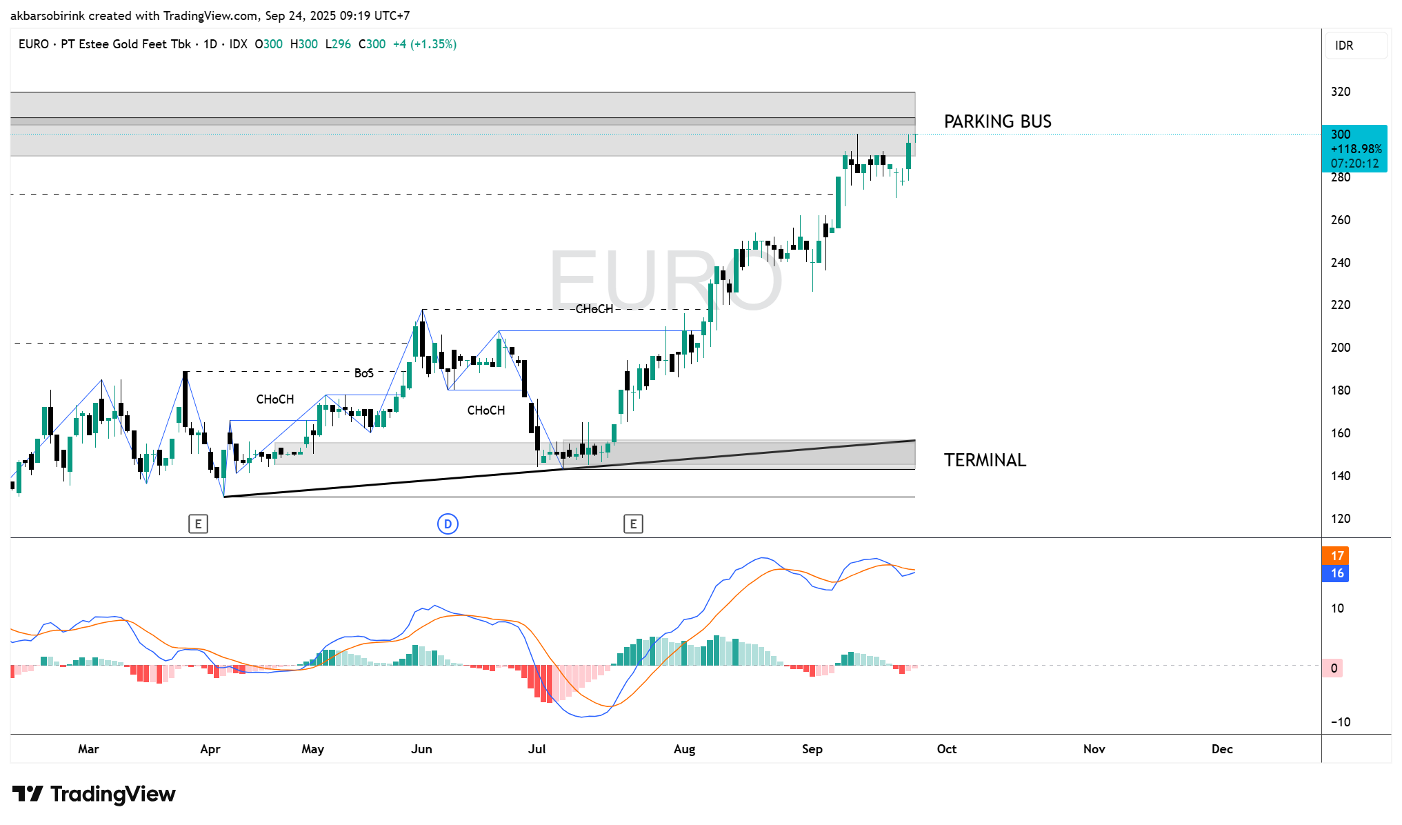 ESSA bullish uptrend dan mulai recovery dari pullback Q2, suport kuat di 700–715 dengan momentum volume. Entry ideal di pullback support, skalakan pada breakout resistance, disiplin trailing stop dan risk management.