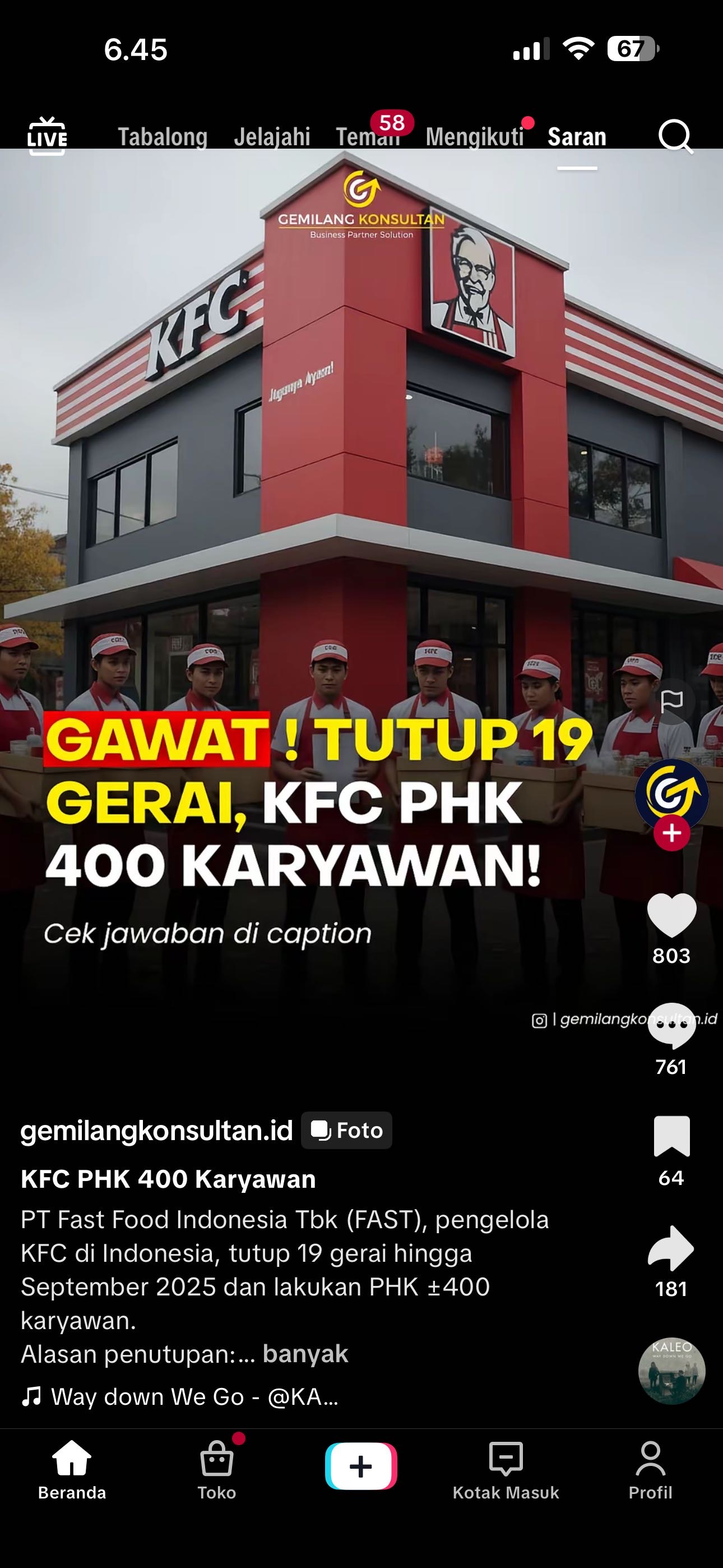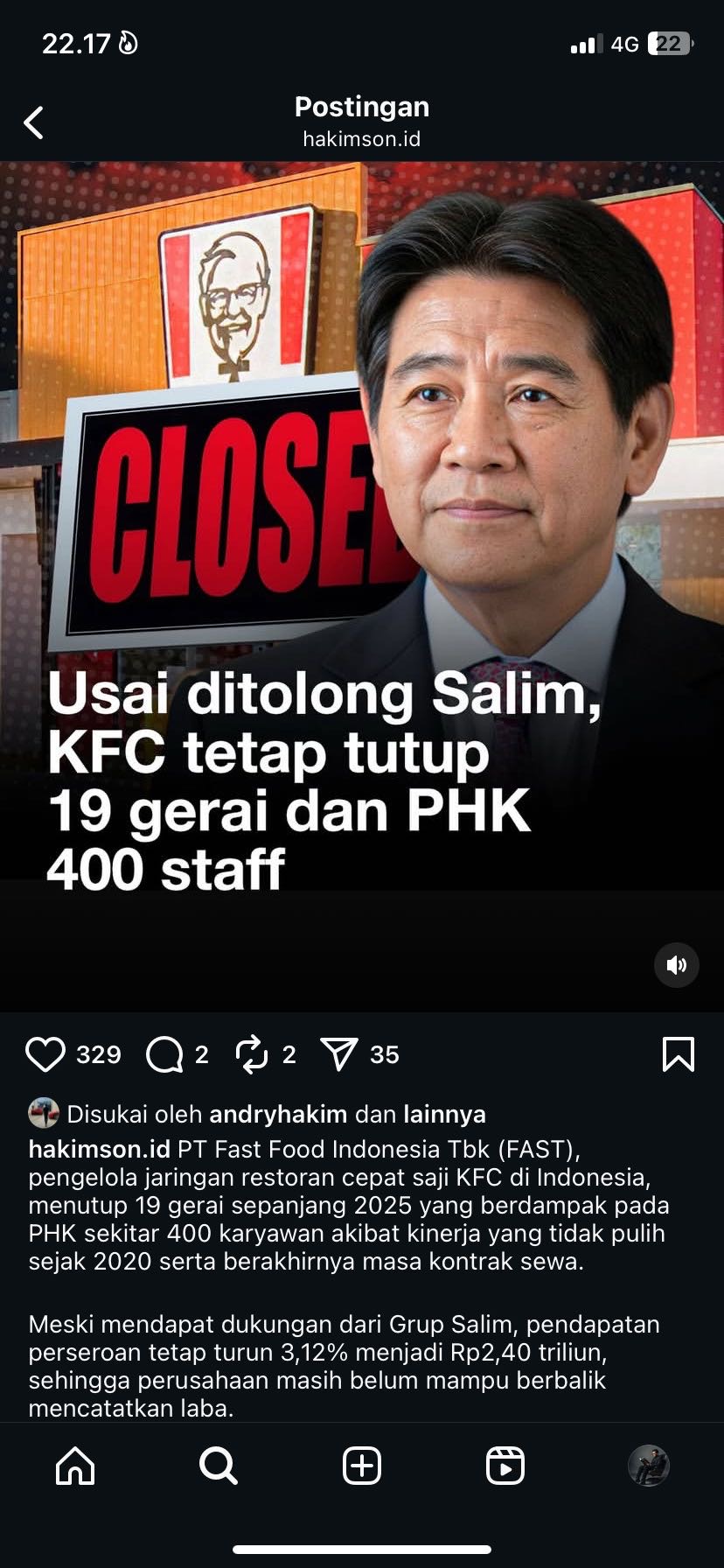 Jakarta, CNBC Indonesia - Emiten peritel KFC di Indonesia, Fast Food Indonesia (FAST), mengungkapkan telah menutup hingga 19 gerai sepanjang tahun 2025. Akibat penutupan tersebut, sebanyak 400 karyawan terimbas dan mengalami pemutusan hubungan hubungan kerja (PHK).