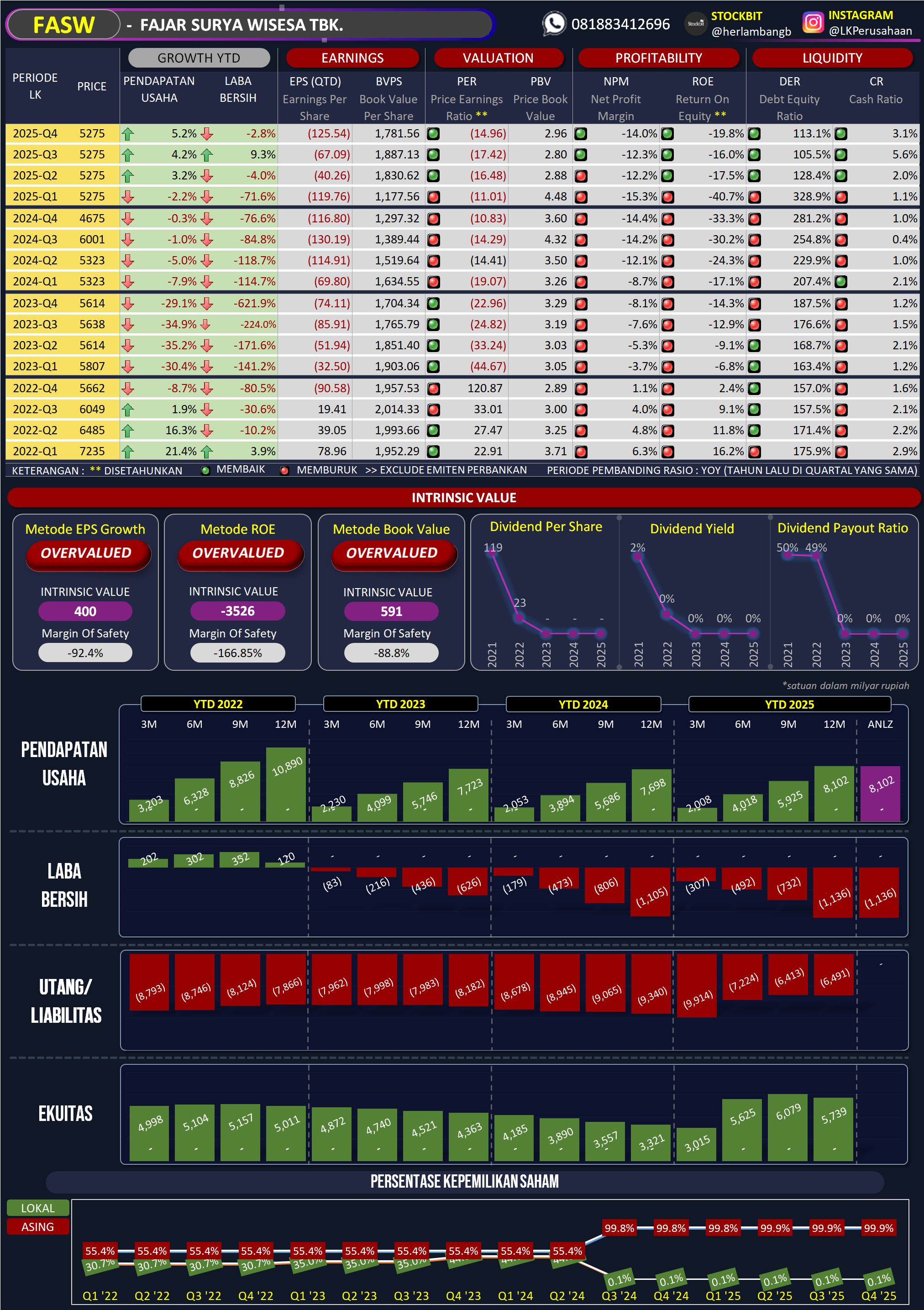 Sebagai mentor, saya melihat FASW sedang dalam fase **"Perbaikan Struktur Modal di tengah Tekanan Operasional yang Berat."** Berikut analisa mendalamnya: