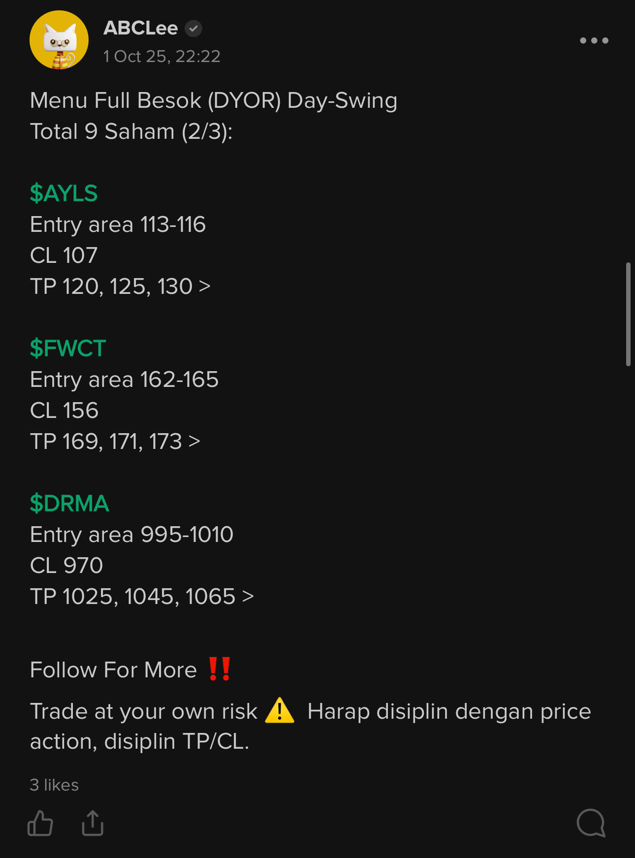 $AYLS dikasih entry di 114 pagi lalu meluncur ke 120, lumayan ya TP1, sekitar 4%