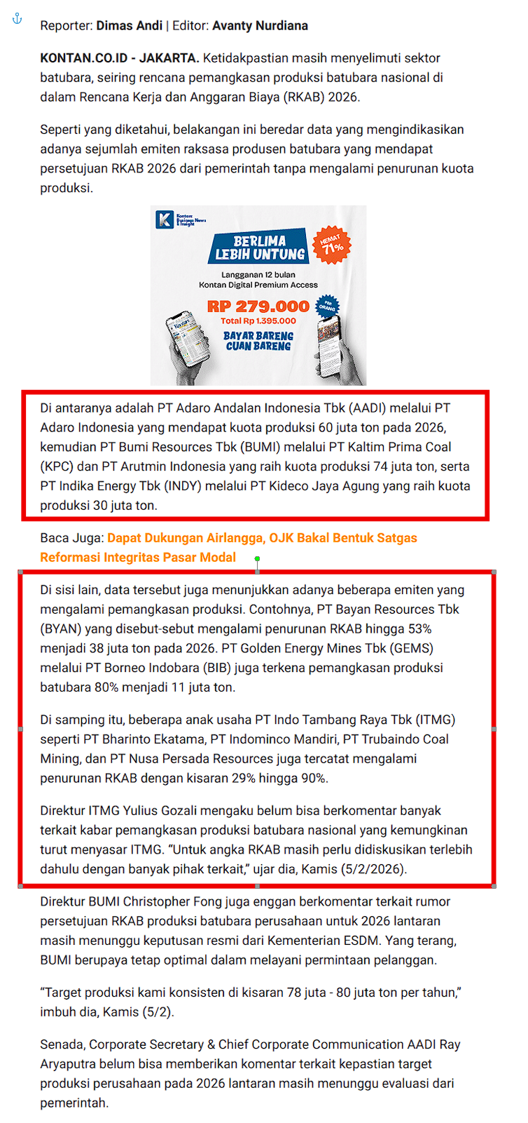 * **Bea Ekspor Baru:** Pemerintah berencana menerapkan bea keluar batu bara sebesar 1-5% mulai 2026. Ini bisa memangkas laba bersih emiten batu bara antara 7% hingga 27%,.
