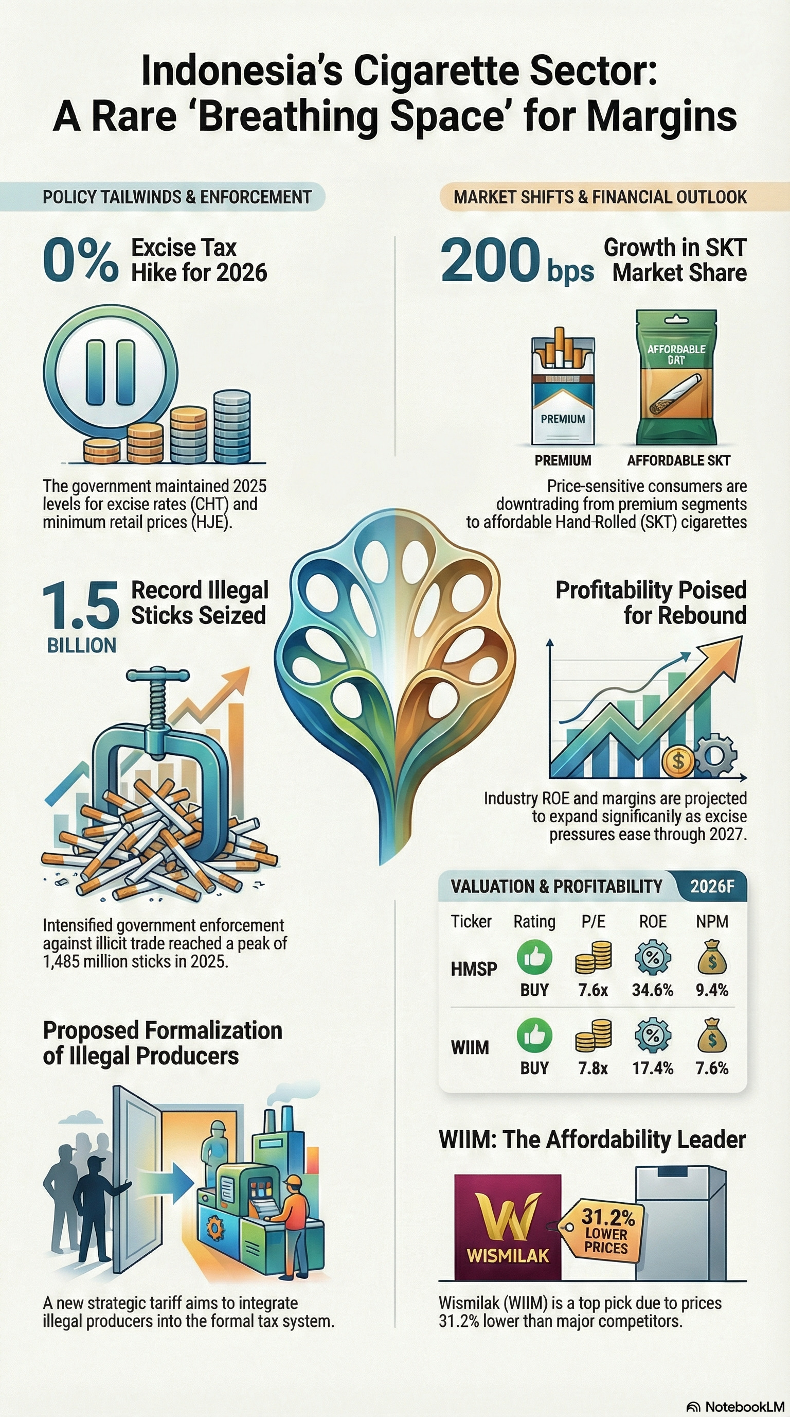 Prospek saham rokok di tahun 2026 diringkas dalam pandangan Overweight (positif), yang didorong oleh kebijakan pemerintah yang memberikan "ruang bernapas" bagi marjin keuntungan perusahaan. Setelah bertahun-tahun tertekan oleh kenaikan cukai, sektor ini diperkirakan akan mengalami pemulihan laba yang signifikan.