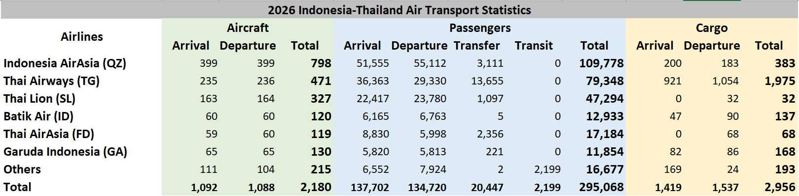 Data Penerbangan Indonesia dari dan ke Thailand tahun 2026 hingga bulan Februari