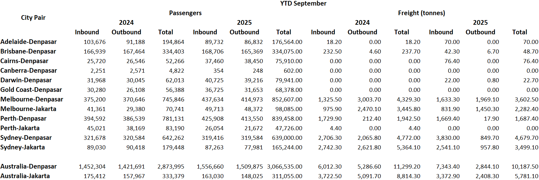 Data penumpang berdasarkan city pair untuk trafik Indonesia-Australia hingga September 2025