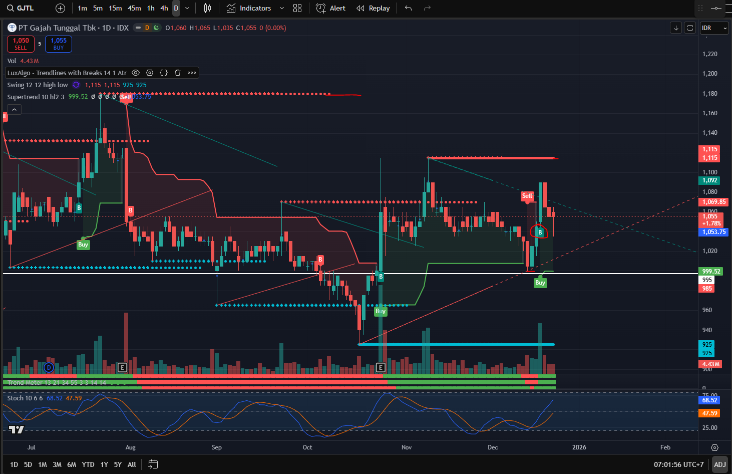 $GJTL beberapa hari lalu terdeteksi trigger buy signal boleh entry buy di 1035-1080 TP1 1130 TP2 1185, kalau naik trus pasang TS untuk kawal profit, SL 995.