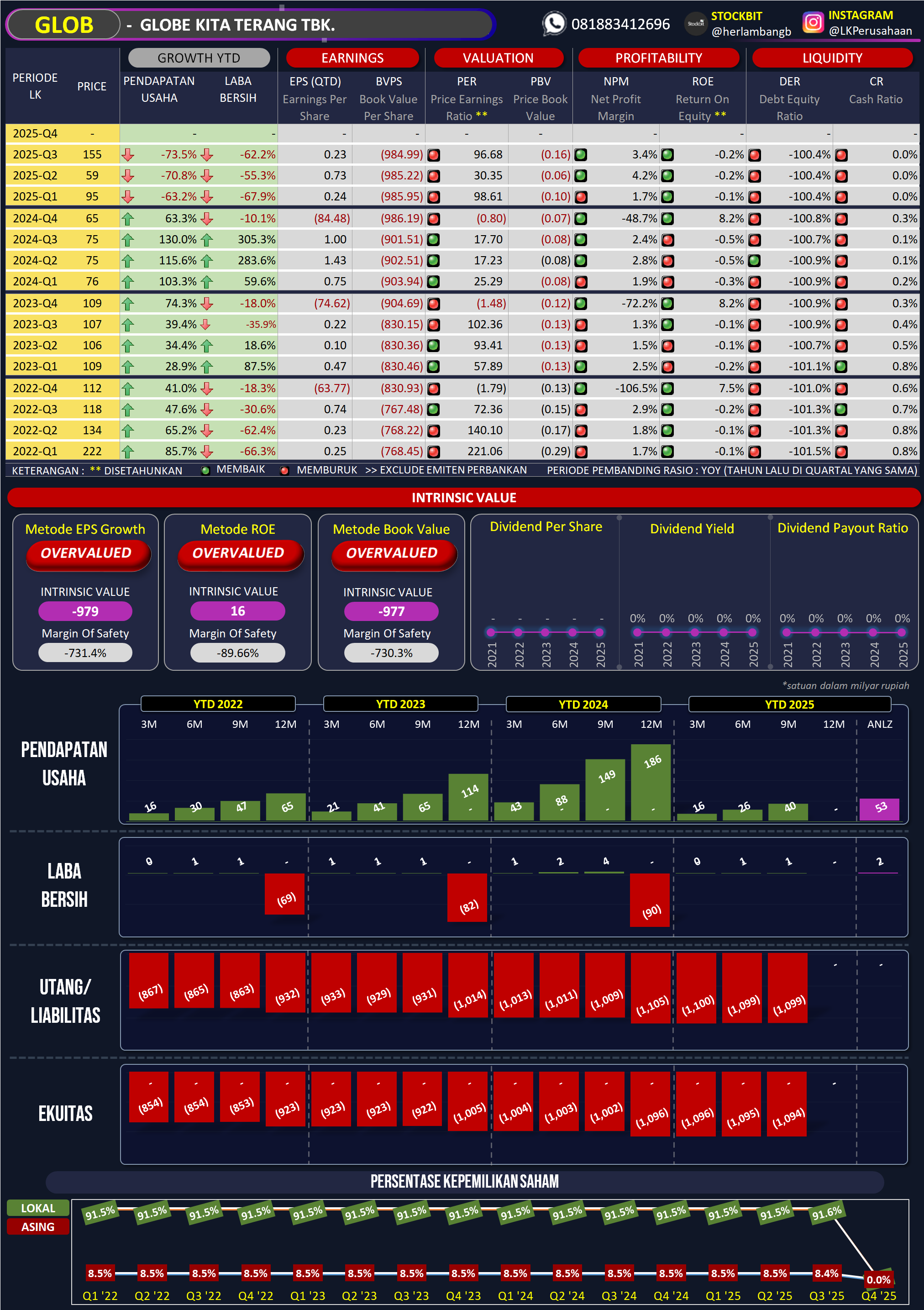 PT Globe Kita Terang Tbk didirikan pada tahun 2007. Kegiatan Usaha Perseroan ialah menjalankan usaha dalam bidang industri pengolahan, perdagangan, informasi dan komunikasi, aktivitas keuangan, aktivitas penyewaan dan sewa guna usaha tanpa hak opsi dan penunjang usaha lainnya dan aktivitas jasa lainnya. Perseroan memperdagangkan produk-produk perangkat telekomunikasi meliputi telepon seluler dan aksesoris dari merek ternama seperti Samsung, Vivo, Oppo, Realme dan lainnya. Perseroan juga menyediakan berbagai produk pelengkap untuk telepon seluler, termasuk simcard dan voucher, baik fisik maupun elektronik dari operator terkemu... Read More