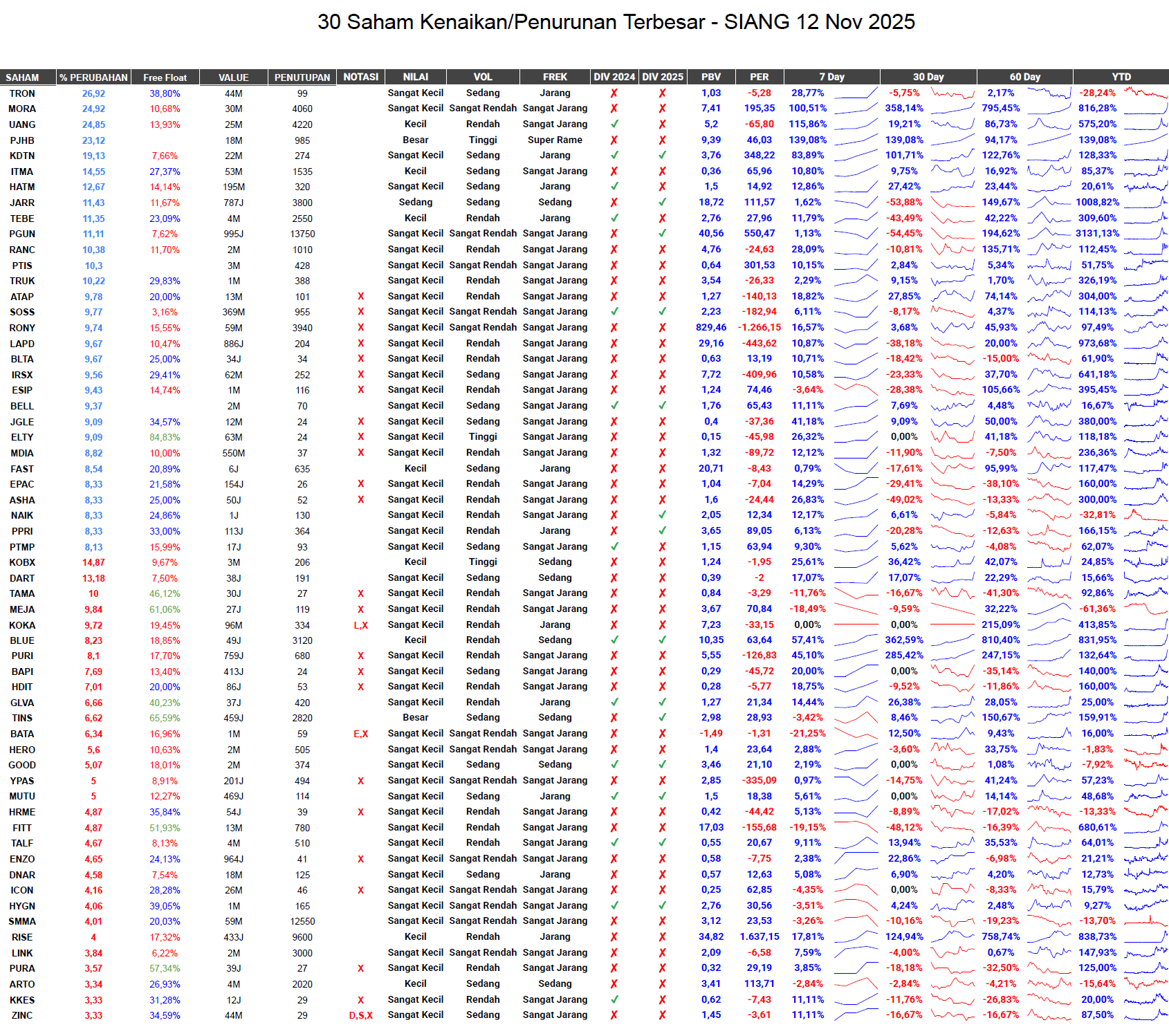 Saham menyentuh ARA berulang di Oktoberβawal Nov 2025, mencatat rally +650% YTD, volume masif, unsuspend 11 Nov 2025 dan rebound perdagangan di pasar reguler.β