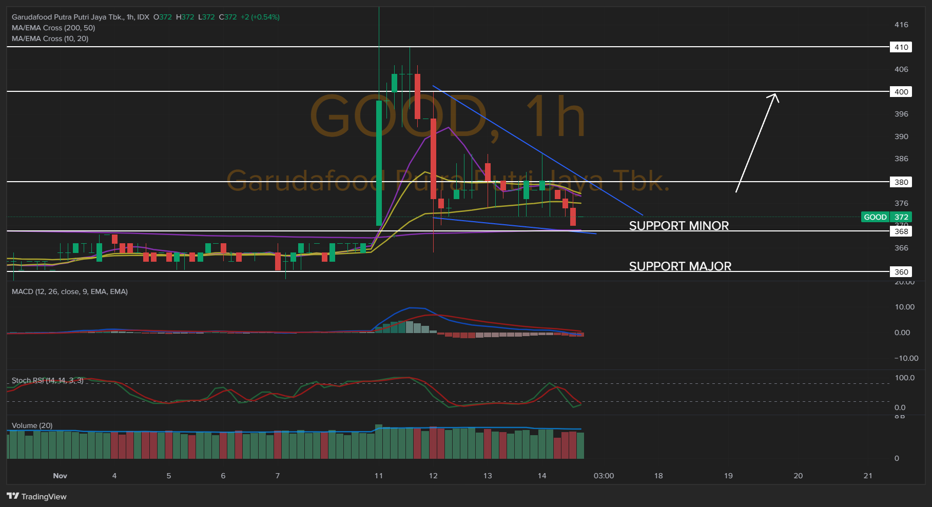 GOOD adalah emiten produsen makanan yang secara fundamental cukup solid dengan profitabilitas dan efisiensi operasional baik. Utang relatif rendah untuk sektor consumer. Dari sisi teknikal, harga saat ini berada di dekat support kuat dan tren jangka pendek mengarah positif, meskipun tekanan jual masih ada. Cocok untuk investor jangka menengah-panjang dengan MA30 sebagai level penting pantau support dan potensi rebound di dekat Rp358-374.