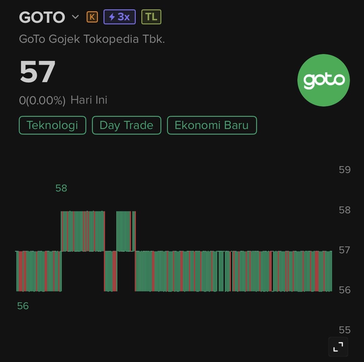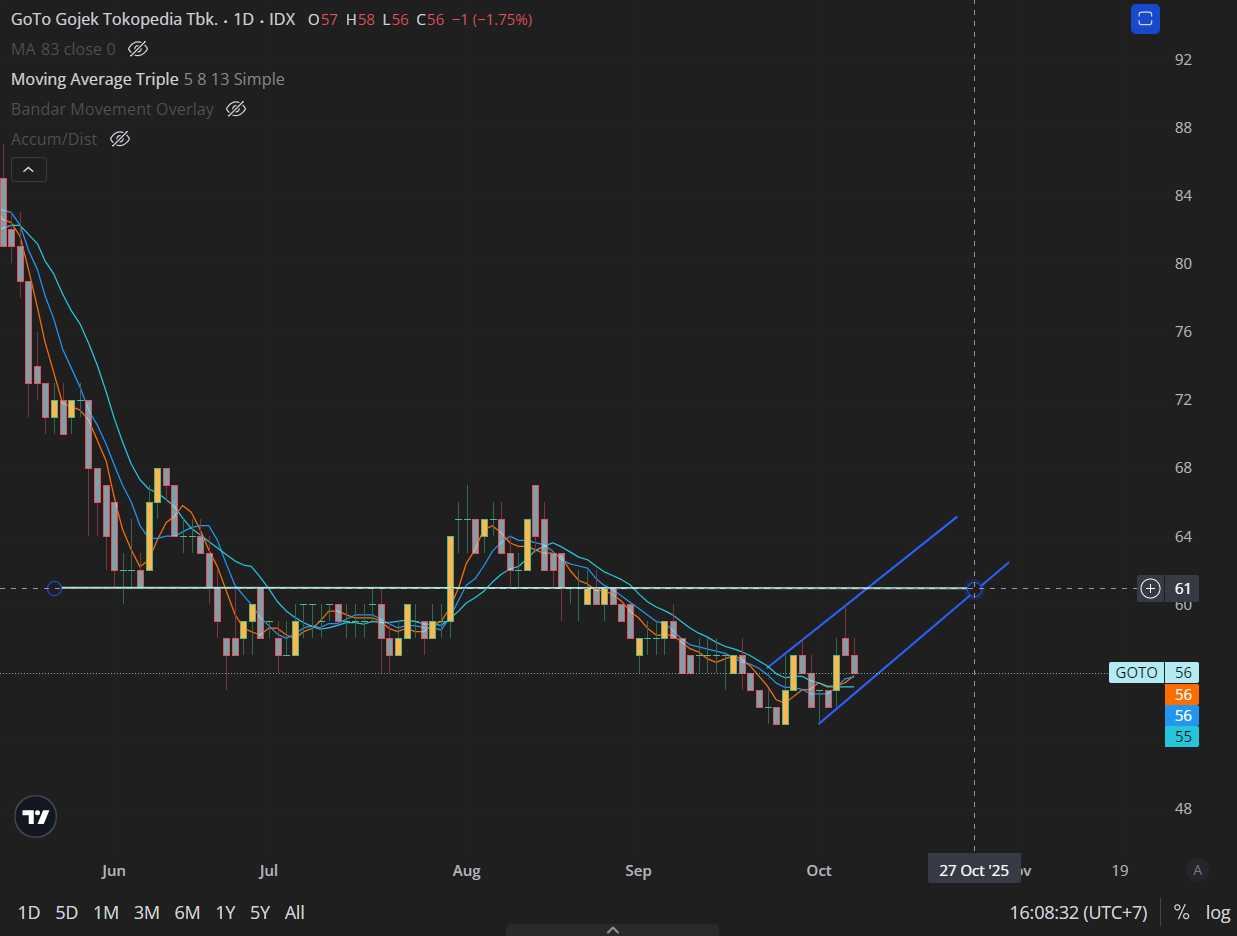 Saat ini GoTo berada di zona konsolidasi sehat (54ā58).