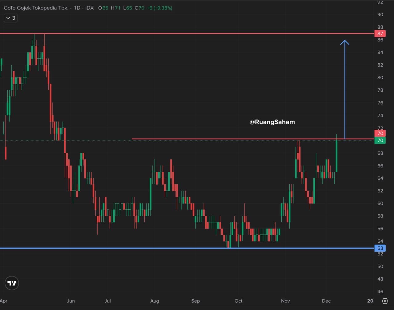 Jika bisa break dan close d atas 70 besok, maka ada potensi GOTO bisa kembali naik ke area resistance 85-87 ! masukkan watchlist terlebih dahulu untuk besok ya ! good luck ! #BukanRekomendasi #AnalisaKembali #NoPomPom #DisclaimerOn #NFA #DYOR #BukanRekomendasi