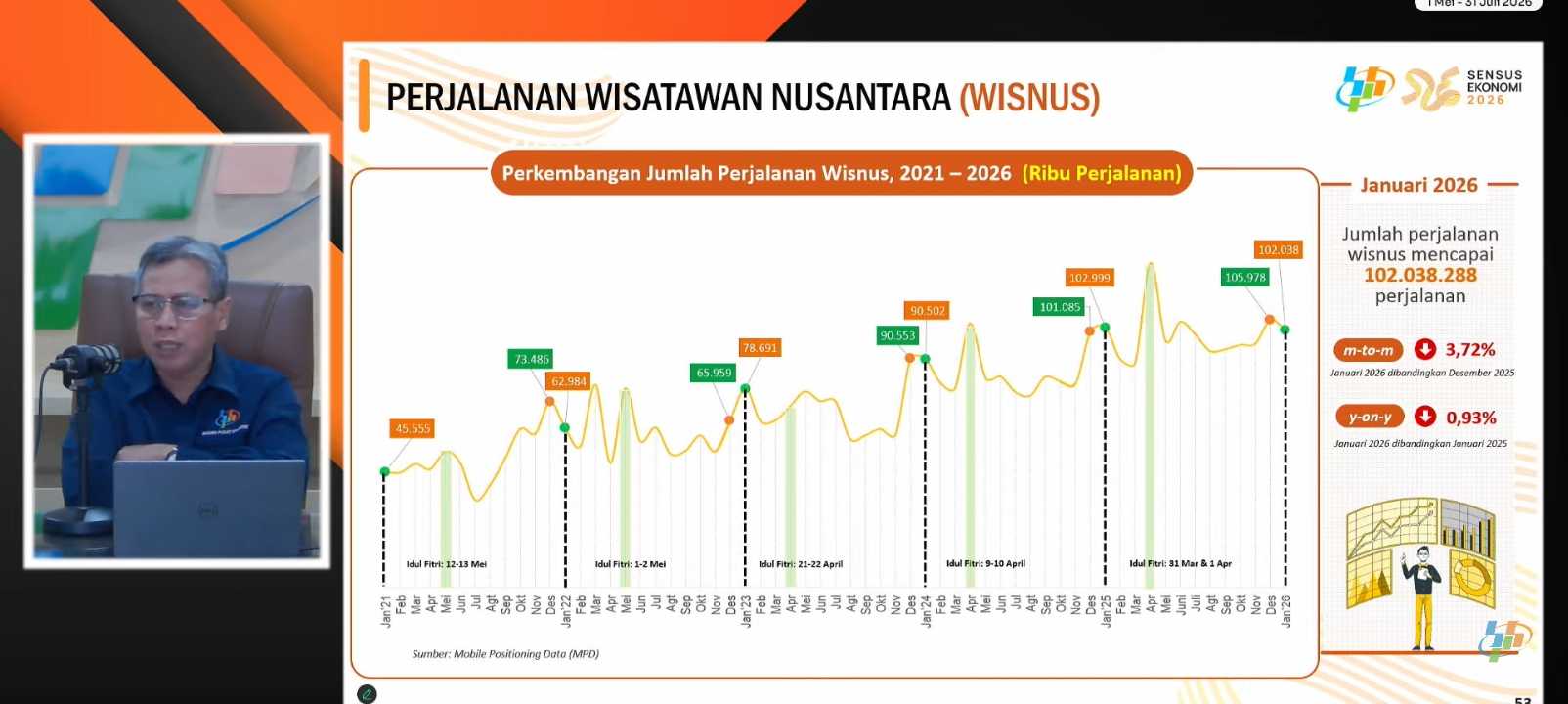 ➖ Perjalanan wisnus (dalam negeri) Indonesia menurun tipis -0,93% yoy pada Jan 2026.