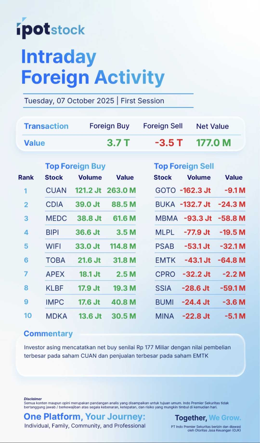 Di tengah penguatan itu, investor asing mencatatkan net buy Rp177,04 miliar di seluruh pasar, dengan nilai total pembelian Rp3,68 triliun dan penjualan Rp3,50 triliun...