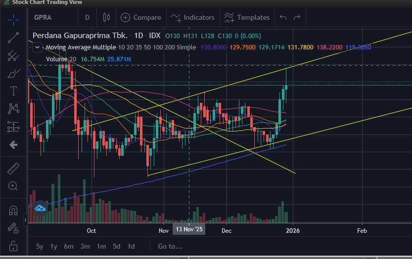 Reasoning: Sektor properti mengalami rerating strong sepanjang 2025 dengan katalis BI Rate rendah 4,75% mendorong minat KPR dan rotasi dana ke beta tinggi. Chart GPRA menunjukkan bullish momentum +2.14% dengan struktur higher high. Volume 29.22M dan frequency 5.14K mengindikasikan participation meningkat. Meski laba 9M25 turun -7.4% YoY, Q3 standalone naik +306% QoQ menunjukkan turnaround. Fundamental solid dengan Debt/Equity 0.37x, strategi ekspansi affordable housing tepat sasaran. RSI 68.2 mendekati overbought namun masih ada headroom.