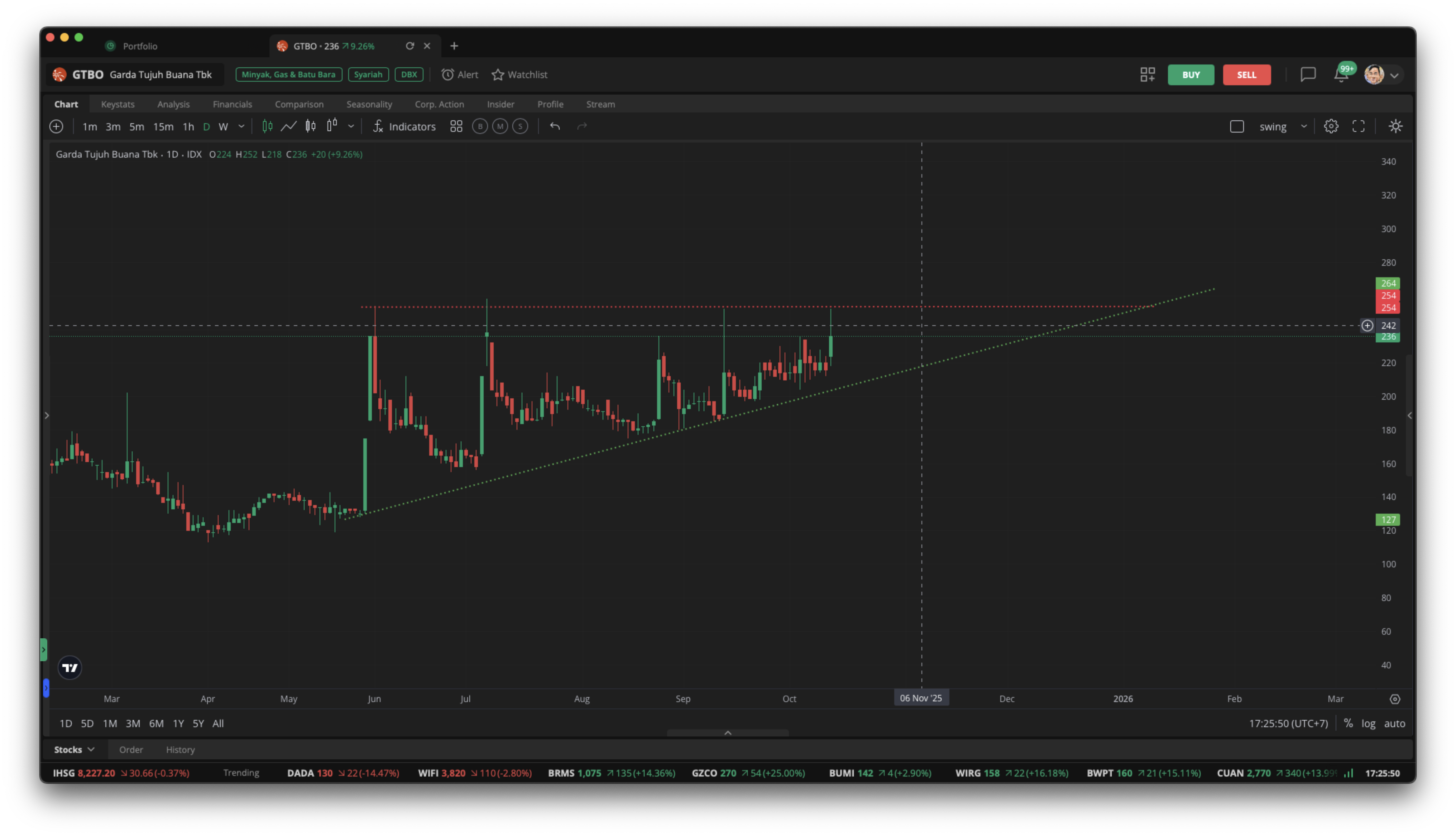PT Garda Tujuh Buana Tbk. (GTBO) didirikan pada tahun 1996. Perusahaan telah diberi Kuasa Penambangan Eksploitasi. GTBO menangani operasi pengolahan penambangan batubara dan logistik secara terpadu. GTBO melakukan penambangan batubara termal dan dianggap sebagai salah satu produsen batubara yang menambang dan menjual batubara yang bernilai kalori rendah. GTBO telah memastikan dan mengidentifikasi cadangan batubara yang signifikan dan sesuai untuk memenuhi kebutuhan pelanggan.
