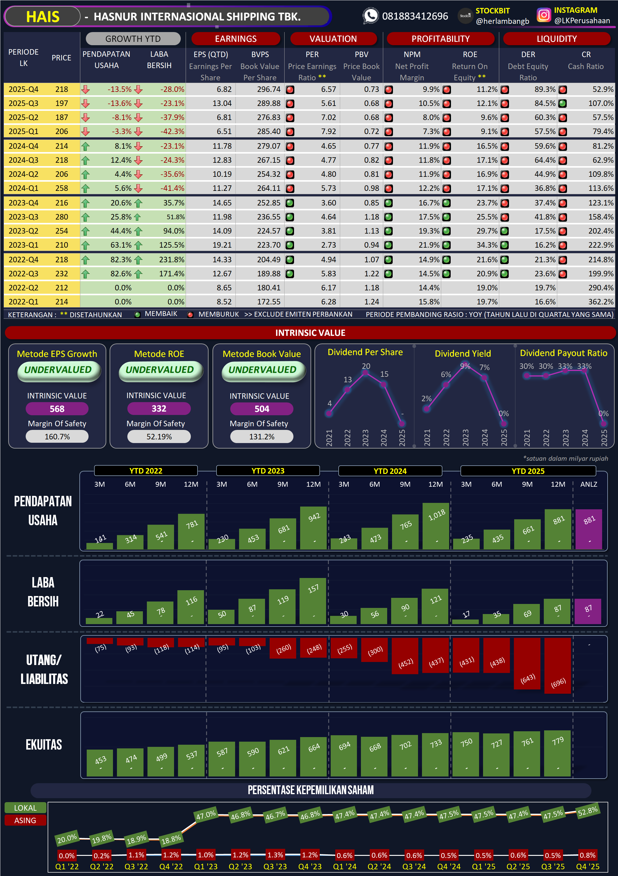 PE Ratio (TTM) 6.57x: Sangat murah secara historis untuk perusahaan shipping. Namun, pasar sedang menghargai HAIS dengan multiple rendah karena tren pertumbuhan laba yang negatif (-27.97%).