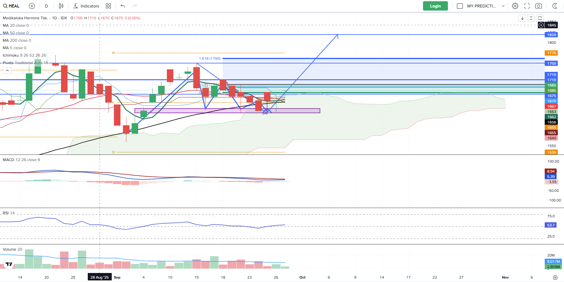 • Moving Average (MA): Garis Moving Average Triple (MA 20, 50, 200) menunjukkan tren jangka panjang yang cenderung naik. Harga saat ini berada di atas semua garis MA, yang mengindikasikan kekuatan tren.