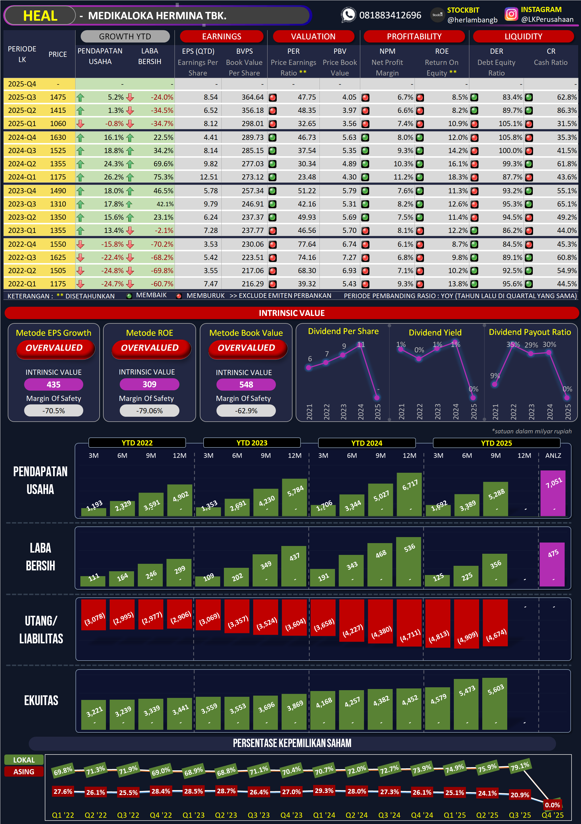 Secara keseluruhan, HEAL menunjukkan pertumbuhan pendapatan yang stabil, namun efisiensi atau beban pokok tampaknya menjadi tantangan yang mempengaruhi laba bersih.