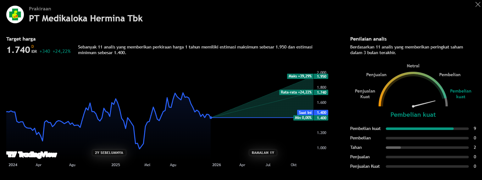 Pengendali sekaligus Komisaris Utama Medikaloka Hermina ($HEAL), Hasmoro, membeli ~2,8 juta saham HEAL dengan harga rata–rata Rp1.385/lembar atau senilai total ~Rp3,9 M pada 16–18 Desember 2025. Setelah transaksi ini, porsi kepemilikan langsung Hasmoro di HEAL naik dari 4,88% menjadi 4,9%.